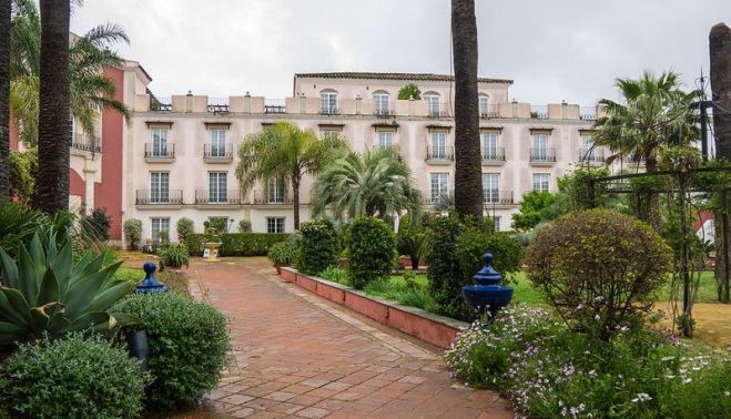 "El Hotel Palmera Plaza —reza la oferta— tiene una categoría de 5 estrellas y 52 habitaciones, y actualmente se encuentra cerrado. Este emblemático hotel se compone de 3 edificaciones. En la primera se encuentra el vestíbulo, un restaurante, una cocina y oficinas. En la segunda edificación se alojan las 52 habitaciones. La tercera es la bodega que se destina a salón de eventos con capacidad de 350 comensales". En medio, el que en su día fue un vergel, con árboles y parterres. La oferta es suculenta, 252 euros el metro cuadrado, aunque claro, la reforma es costosa para quien adquiera esta propiedad hotelera.