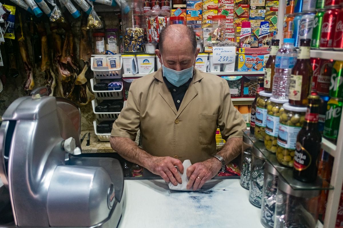 José Sánchez, de 79 años, lleva 65 detrás del mostrador de este local de la calle Palacios esquina con San Bartolomé que sigue vendiendo legumbres a granel envueltas en papel de estraza junto a la casa donde residió Washington Irving en el siglo XIX. No cabe ni un alfiler en aquel rincón lleno de productos de alimentación ordenados perfectamente en las estanterías. No faltan garbanzos, habichuelas, miel pura del pinsapar, conservas, bacalao, una hilera de jamones, botellas de vino, quesos y botes con fabes.