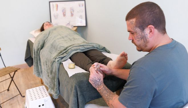 Su trabajo se enfoca en trabajar los puntos reflejos, es decir, las zonas del pie que están conectadas con órganos y partes del cuerpo. “Con los masajes en los pies, podemos tratar el resto del cuerpo. Es una técnica muy agradecida que permite trabajar de todo”, explica el jerezano junto a la camilla donde tumba a las personas que se interesan.