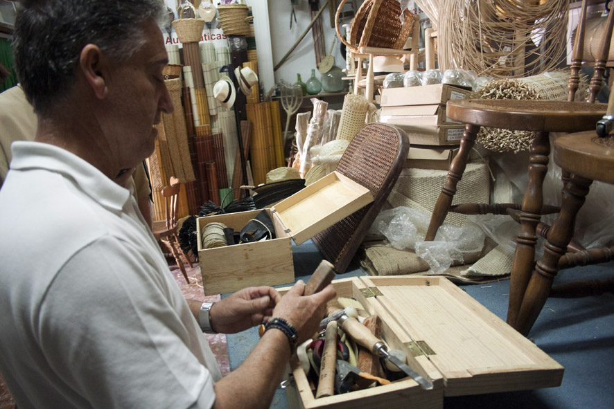 Aprovecha las horas de menos calor para trabajar con más precisión mientras el olor a esparto seduce al cliente. Sentado en una silla con un kit de herramientas personal que usa también para coser en el suelo, Manuel Becerra es el propietario de la espartería situada en la calle Porvera junto a la muralla. Este establecimiento es uno de los supervivientes en la ciudad dedicado a los productos artesanales. Los vecinos del barrio conocen a Manuel de toda la vida y se convierten en parte fundamental del alma de este establecimiento tan encantador.