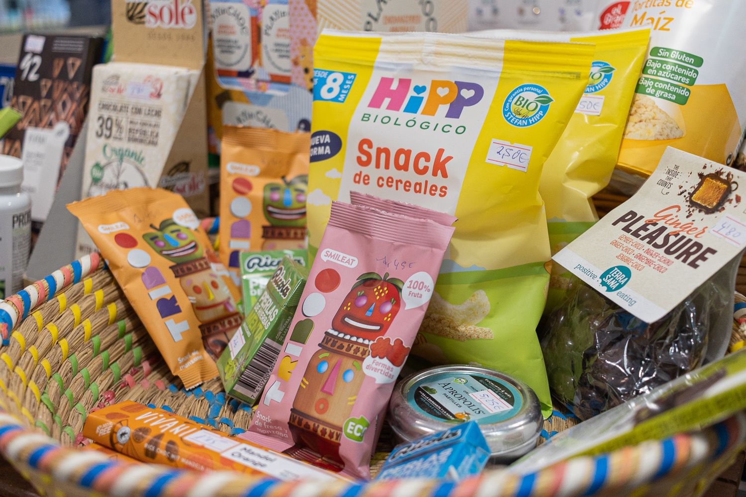 Bajo varias lámparas que cuelgan del techo -también en venta- la puertorrealeña destaca las chuches ecológicas entre las que se encuentra el mítico regaliz Zara o los caramelos Ricola pero “sin azucares o con azúcar de caña integral”.