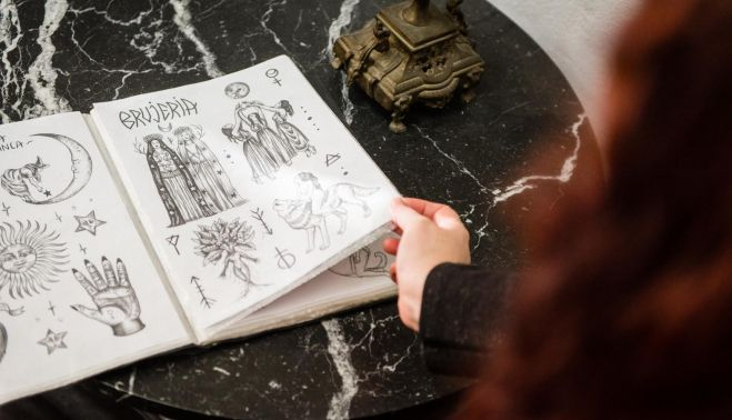 La tatuadora destaca una serie de diseños que hizo sobre brujas andaluzas. "Durante la pandemia estuve investigando sobre ellas y hay miles, las penas durante la Inquisición no fueron tan grandes excepto a la última bruja de España, que era ciega y la quemaron aquí en Sevilla sobre el 1700. Por ahí va la línea de mis diseños y lo curioso es que muchas de las chicas que se las han tatuado son de las ciudades de procedencia de esas brujas", espeta.