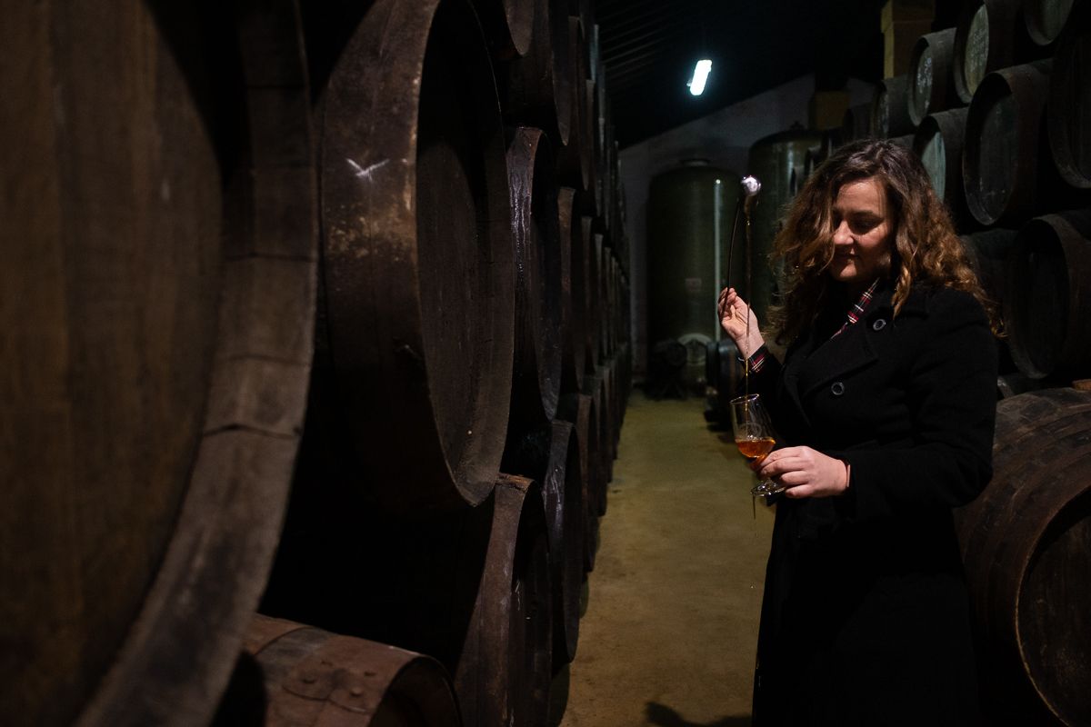 Rocío, que es licenciada en Ciencias Económicas, había vivido el mundo del vino desde que era pequeña, pero no se imaginó que llegaría a dedicarse a ello. "Mi padre me lo propuso y aquí estoy", comenta con una gran sonrisa, conocedora del cambio que supuso en su vida. "A partir de entonces hice el máster de Enología y cursos de todo tipo". Enamorada, como su padre, reconoce que el vino de Jerez es diferente a todos los vinos del mundo, albergando todo un universo por descubrir. "Es complicado comprenderlo y abarcarlo porque en cuanto aprendes algo nuevo se te abren nuevas posibilidades y más aprendes", dice, mientras comenta una anécdota que tuvo recientemente con su amigo y director del laboratorio del jerez, José María Mateo. "Me cambió todos los esquemas en un momento, en el vino de Jerez nunca paras de descubrir cosas", añade sorprendida. "¿Has visto las bolitas de nieve estas que meneas y se revuelve todo?". Es el mágico e infinito del mundo del jerez.