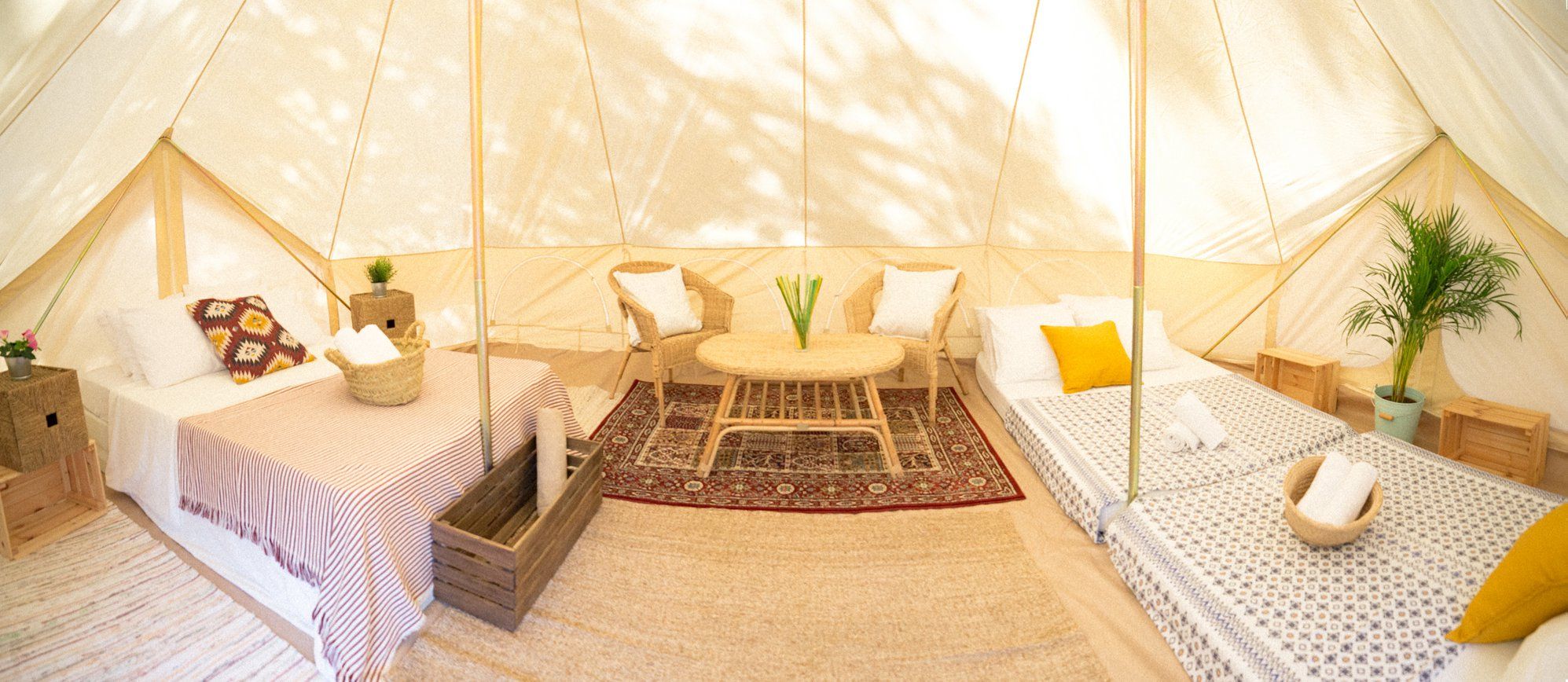 'Kampaoh' ofrece la posibilidad de alojarte en jaimas totalmente equipadas y decoradas en varios puntos cercanos a las playas en la provincia de Cádiz y también en Cataluña