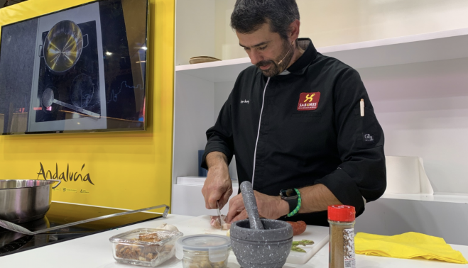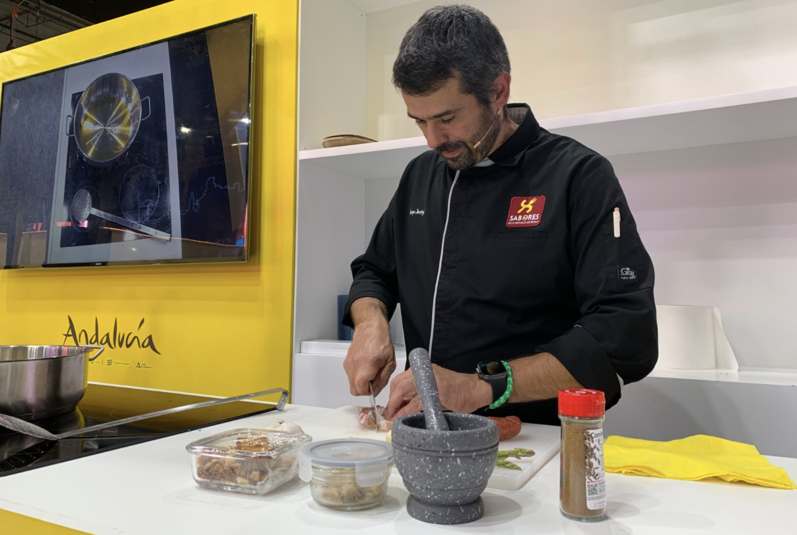 El popular cocinero sevillano y presentador de televisión ha ofrecido a los visitantes del expositor de la provincia la receta Venteras de la Sierra Morena de Sevilla.
