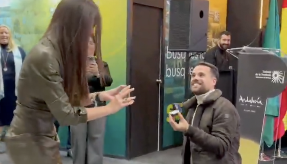 En el primer día de Fitur, que se extiende hasta el domingo 26 de enero, dos andaluces han protagonizado una emotiva escena a la que nadie podía quitar el ojo. Los presentes no se han podido resistir y han sacado sus móviles para grabar el instante en el que Diego se ha puesto de rodillas para pedir matrimonio a su pareja Paloma desde el stand de Andalucía.