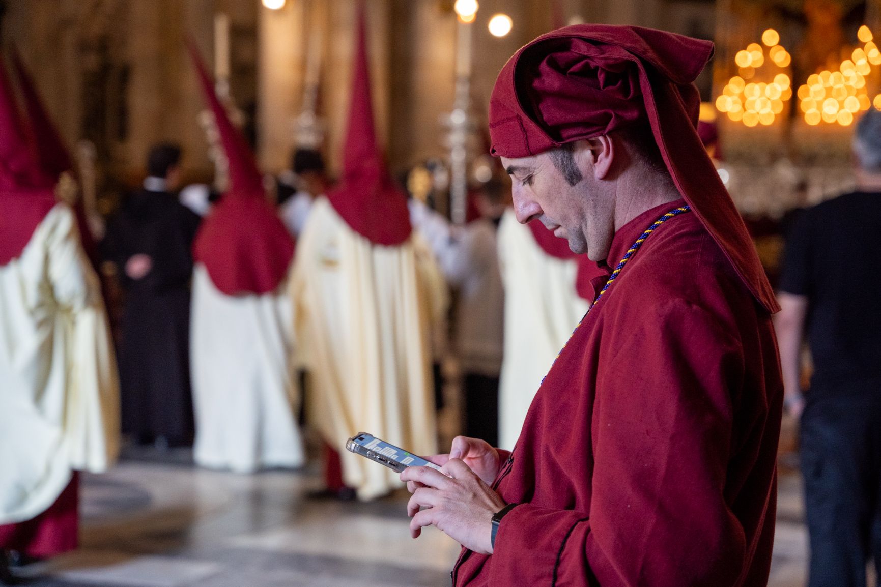 Mayordomo de paso de la Humildad observa a su titular desde la Catedral.