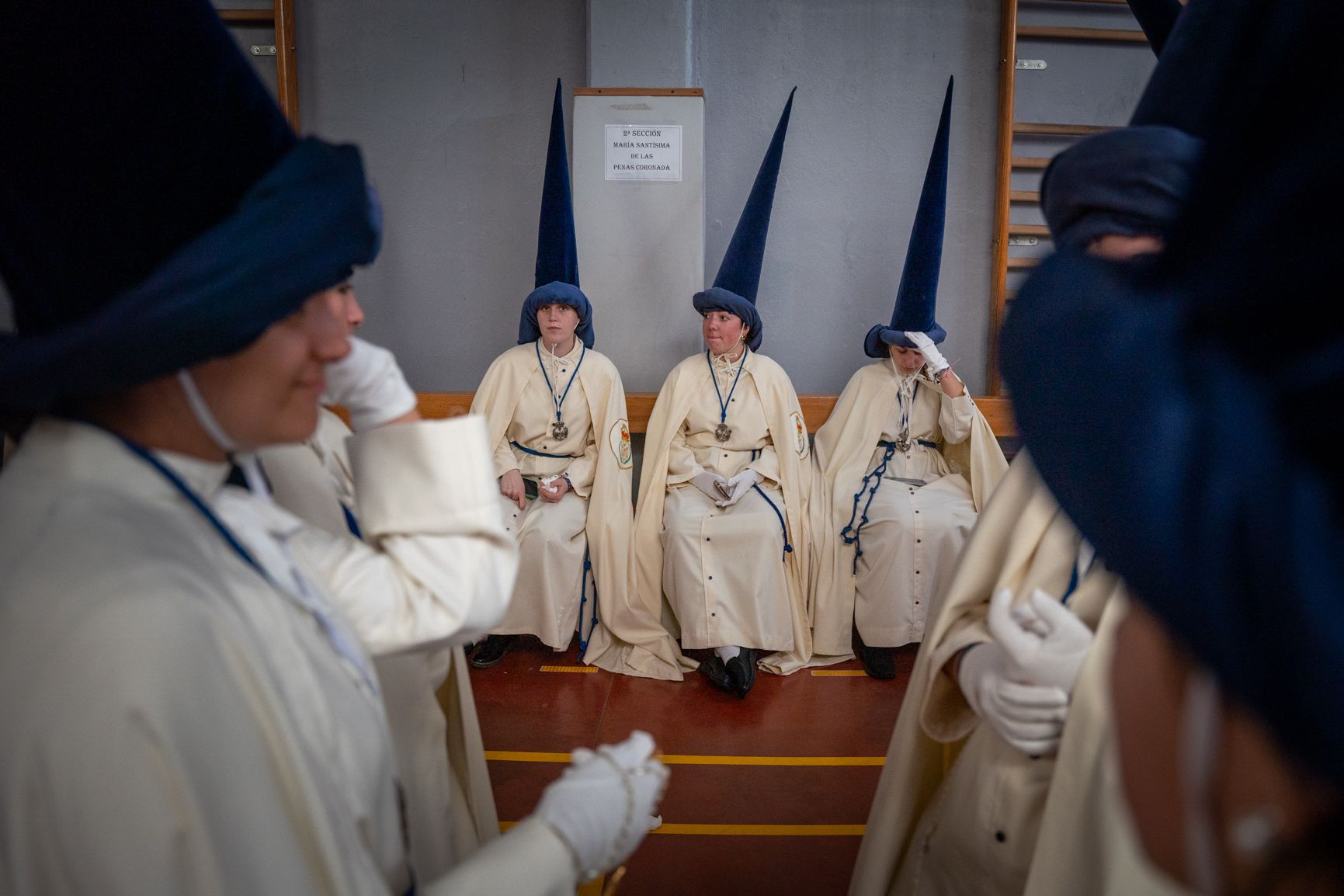 Hermanos de La Palma en el colegio esperando a su salida procesional.