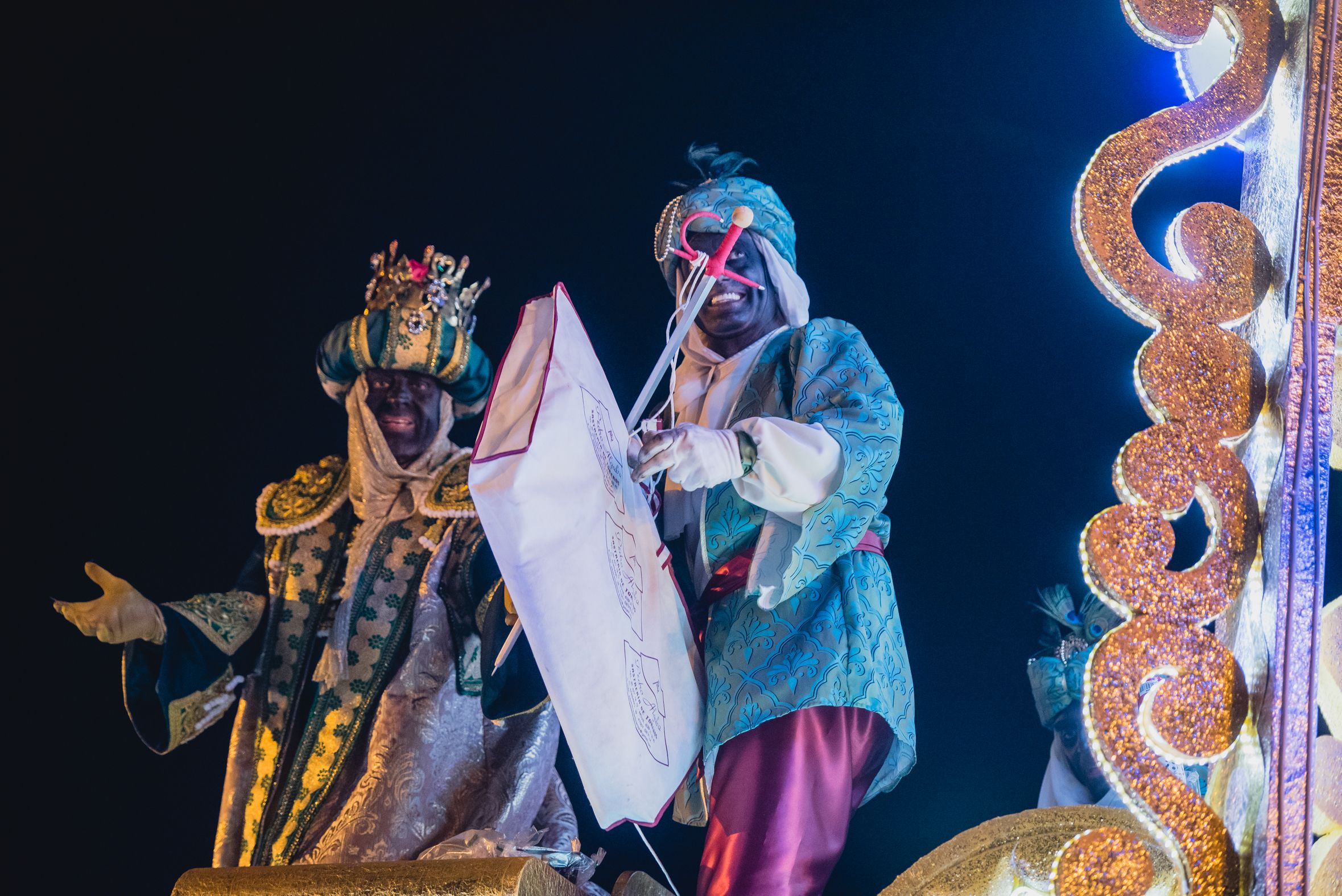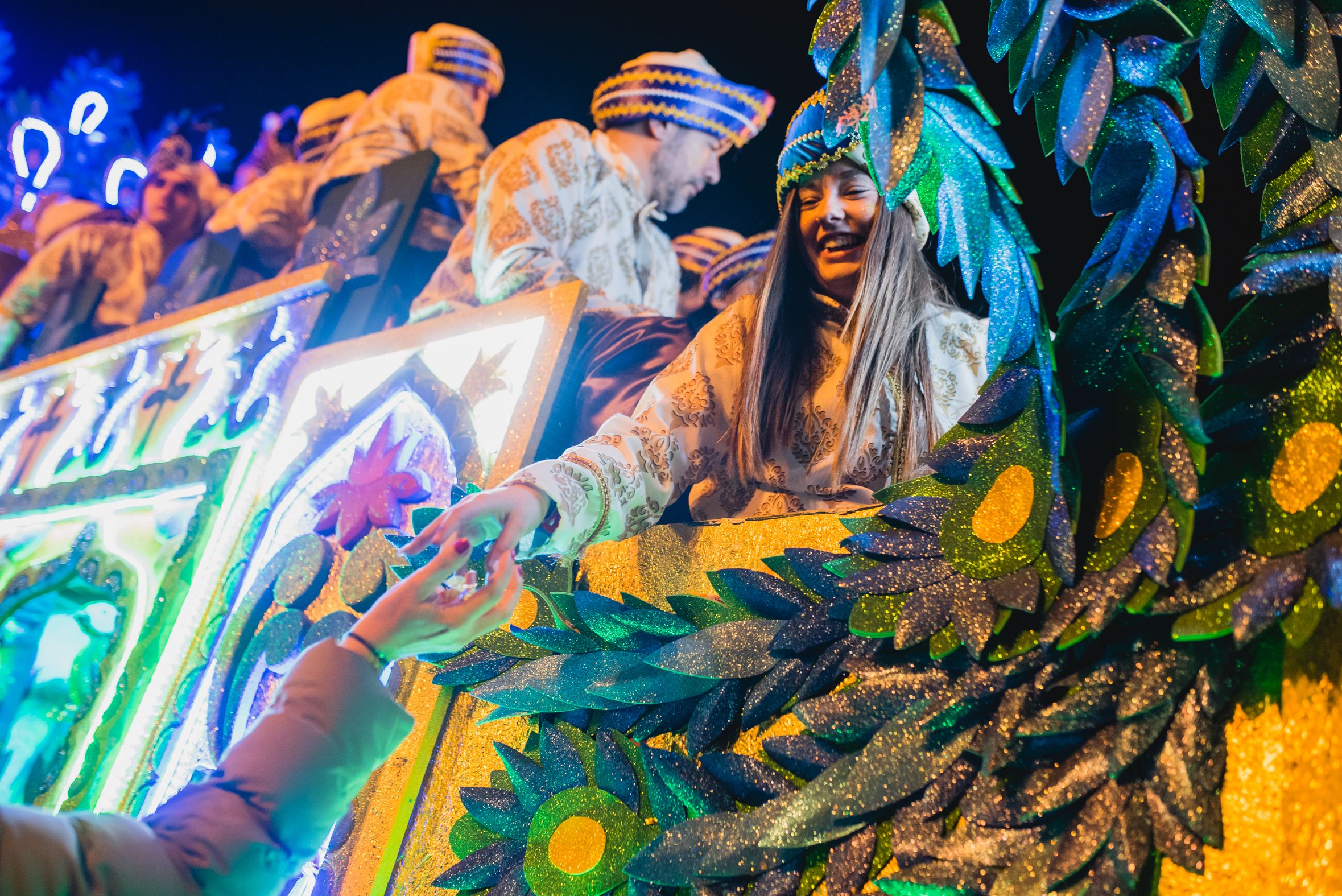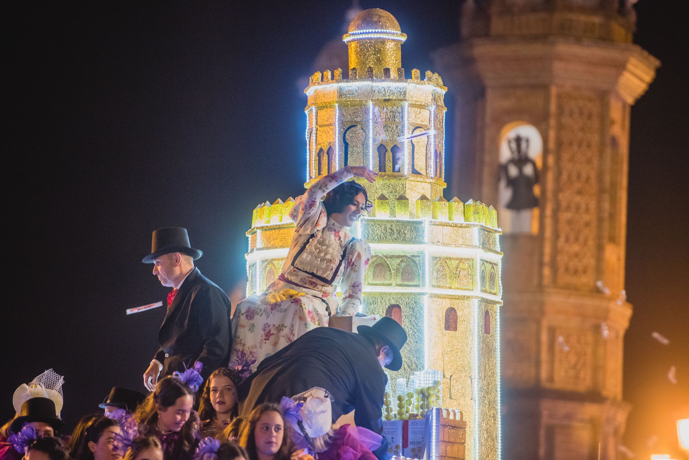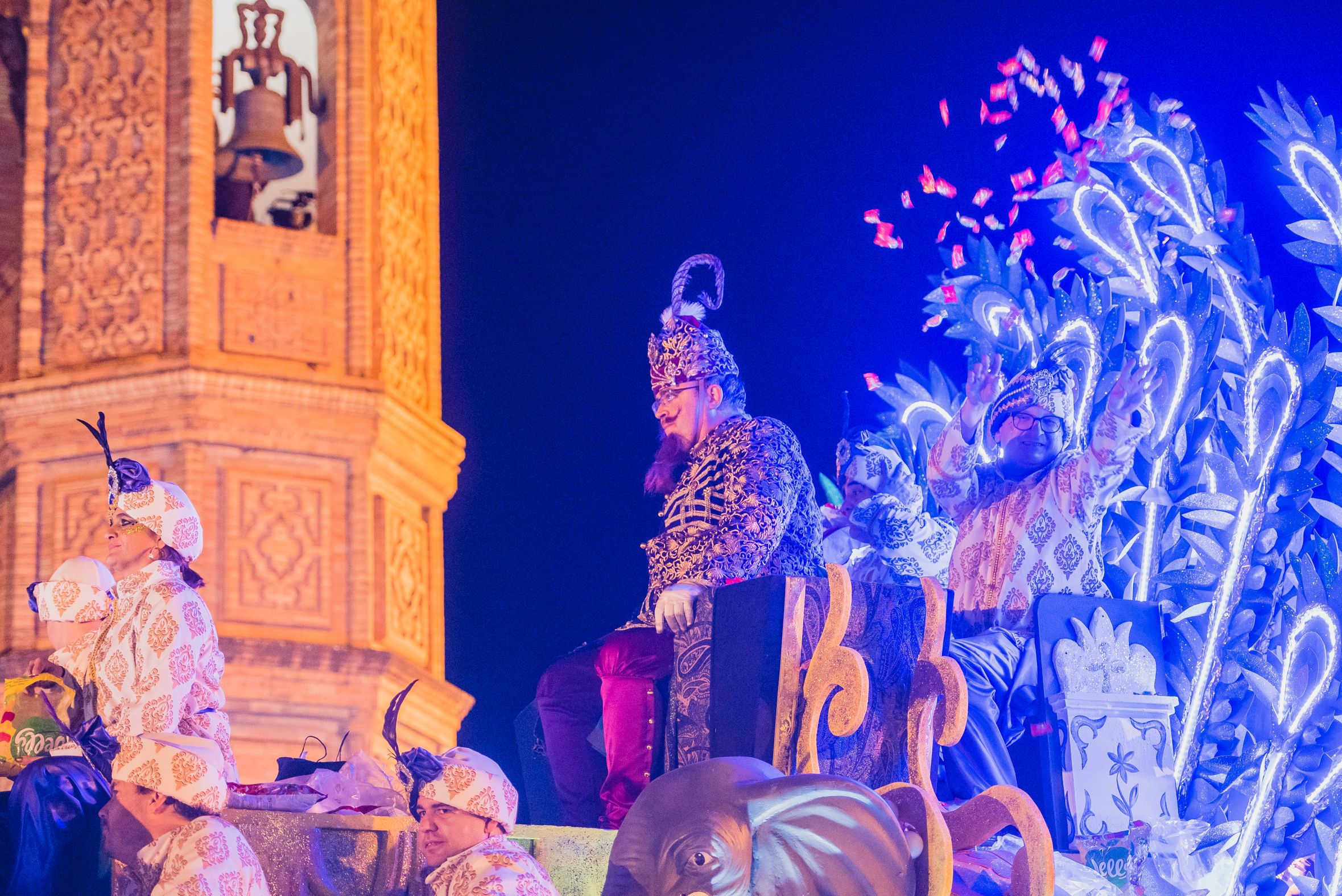 Una beduina lanza papelillos en la Cabalgata de Sevilla.