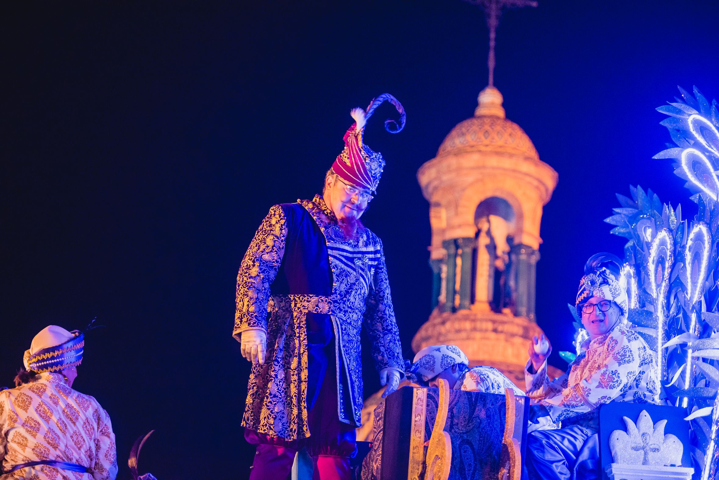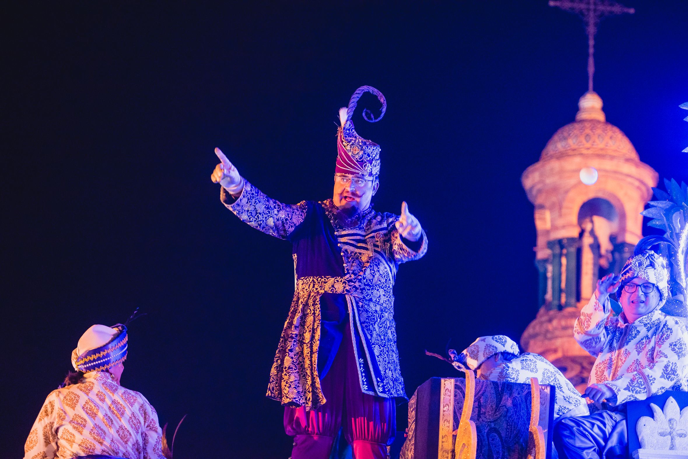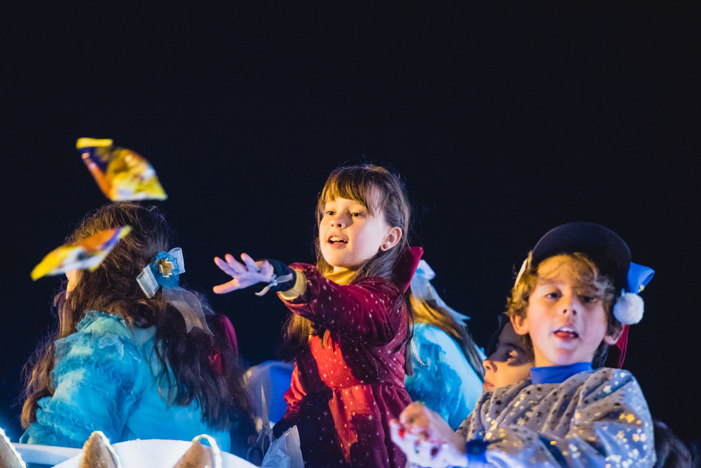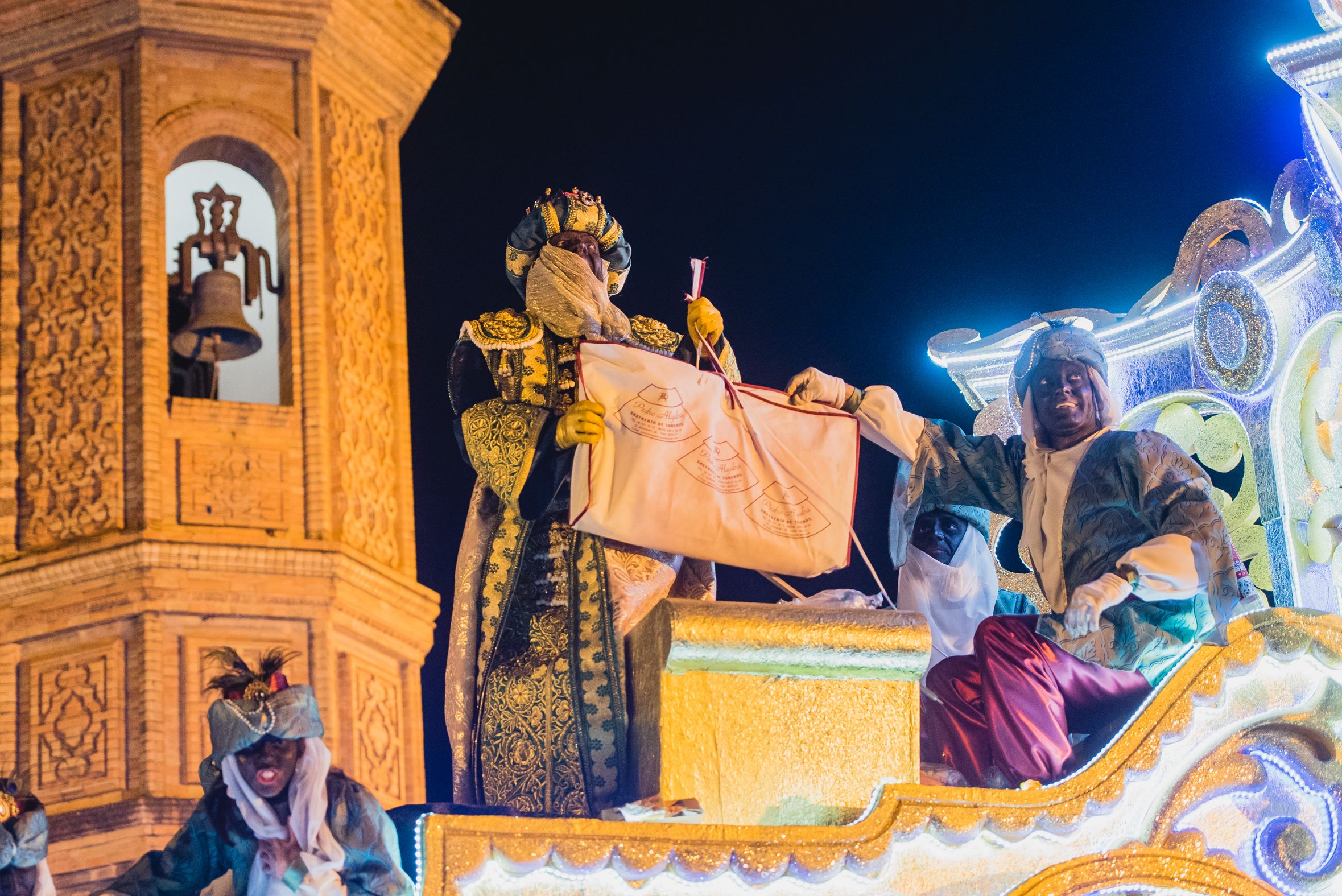 Una beduina lanza papelillos en la Cabalgata de Sevilla.