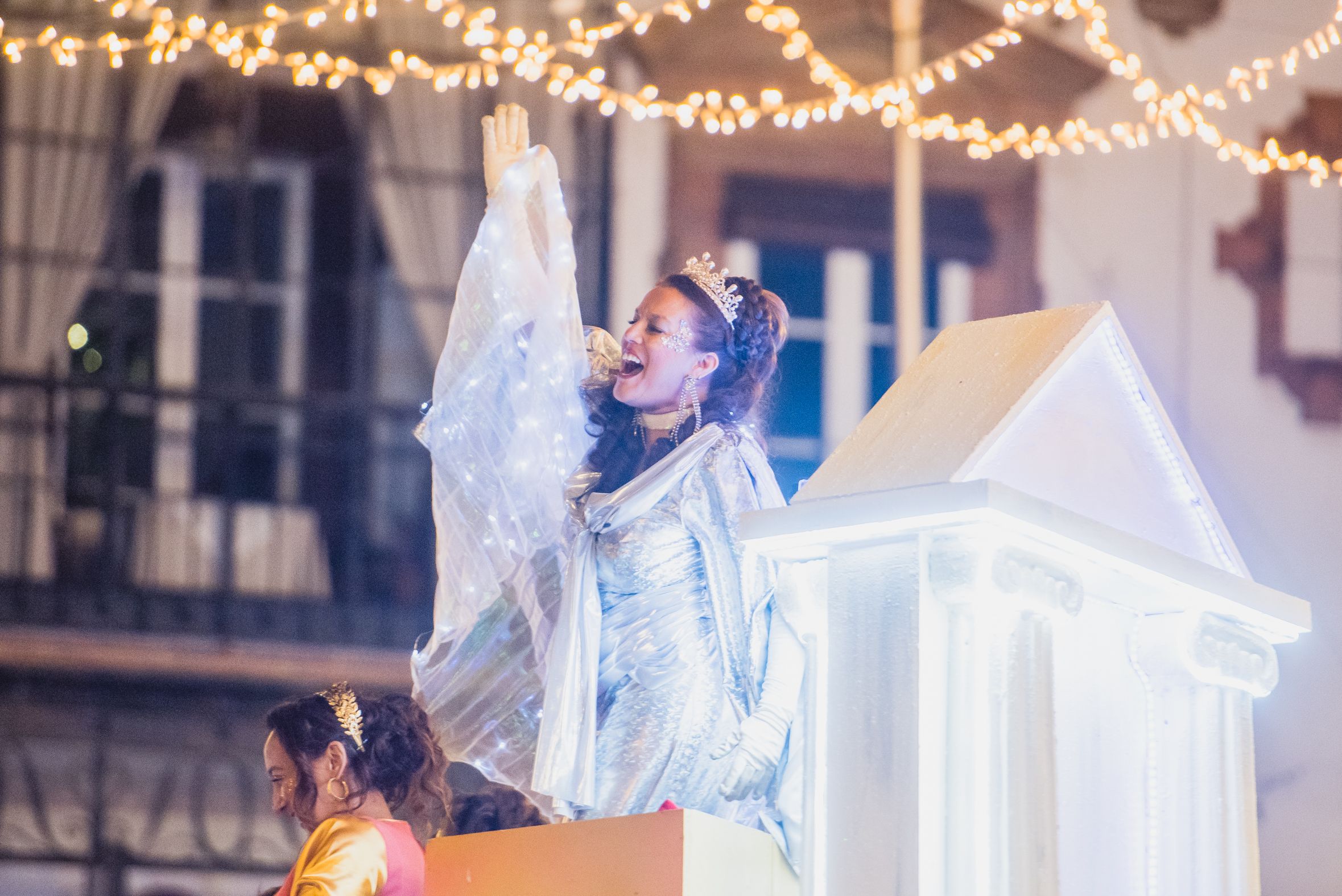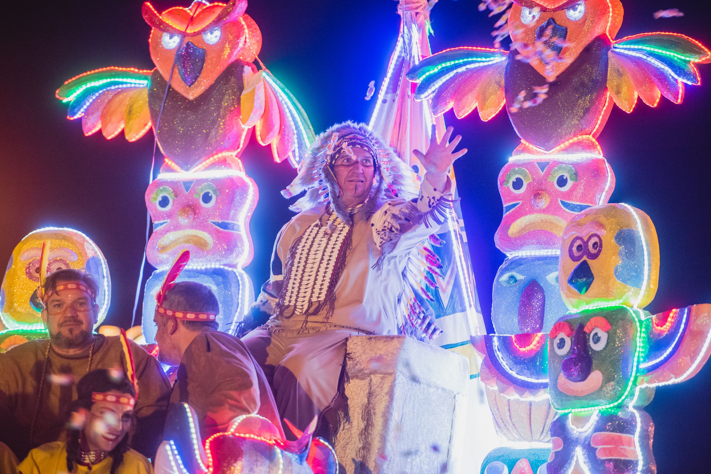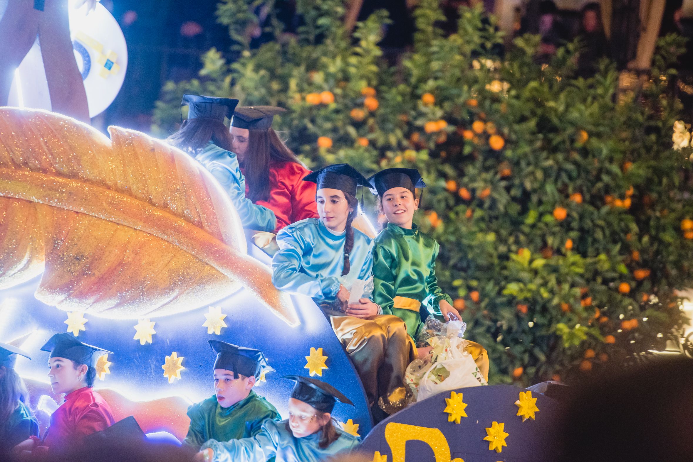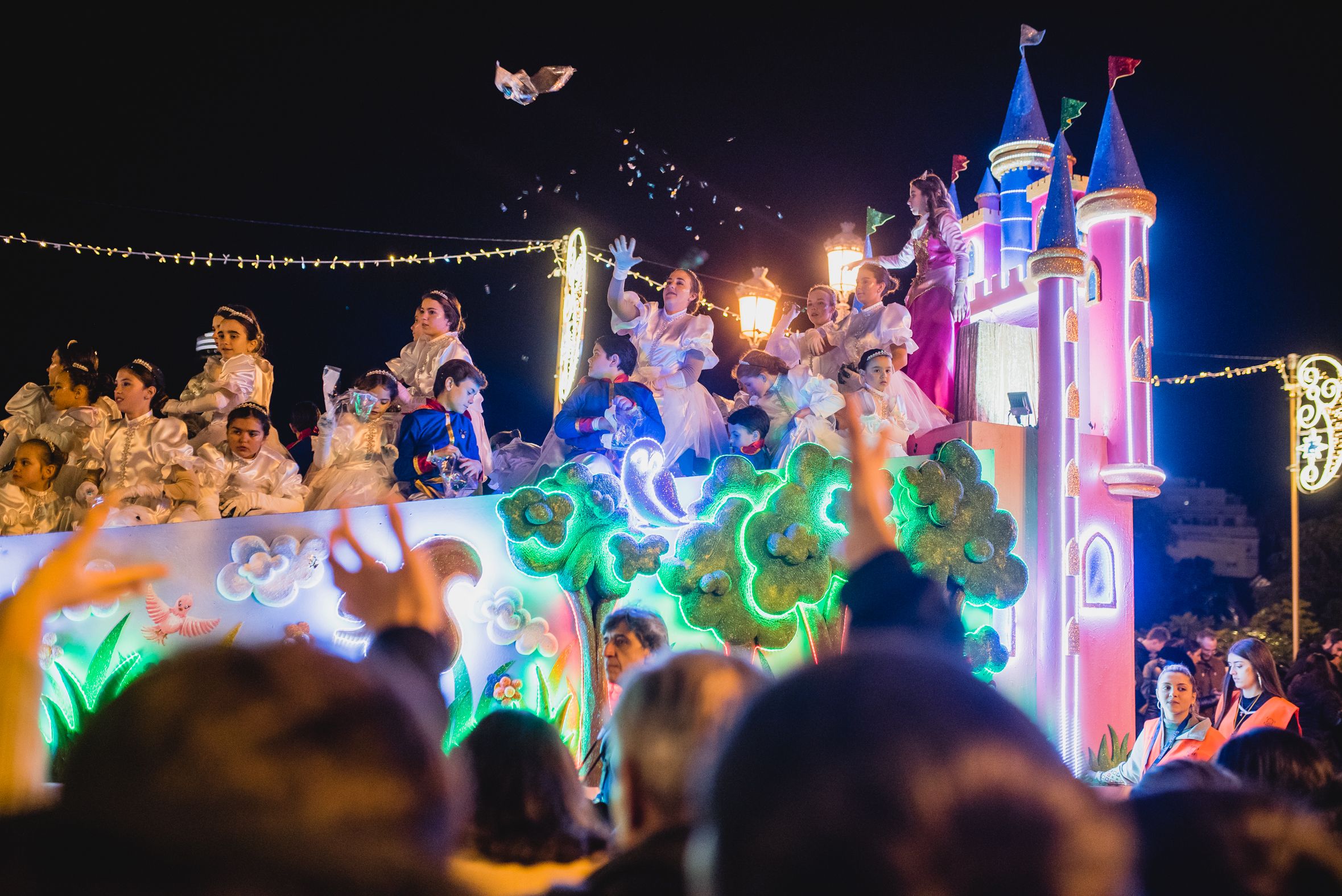 Una beduina lanza papelillos en la Cabalgata de Sevilla.