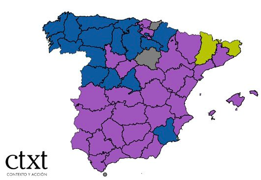 El PP refuerza su hegemonía en provincias como A Coruña (pasa de 1.457 votos a 2.443), Burgos (de 247 a 405), Cantabria (de 365 a 634), La Rioja (204 a 337), León (619 a 859), Lugo (636 a 818), Melilla (de 22 a 44), Navarra (de 343 a 543), Ourense (944 a 1531), Palencia (110 a 169), Pontevedra (1.399 a 2.190), Salamanca (440 a 541) y Zamora (302 a 445). Y muy probablemente, sumará Ceuta y Soria, cuyos resultados CTXT no ha podido comprobar.