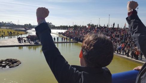 Al fin todo está listo y la sintonía “Saber que se puede, querer que se pueda, pintarse la cara color esperanza” anuncia la segunda llegada de Pedro Sánchez y sus acompañantes. Bajan la escalinata y recorren la pasarela que los llevará a la isla artificial rodeada de agua, bañándose en aplausos. Son aplausos de rabia, como el propio acto. El alcalde de Dos Hermanas y una representante de la plataforma que pide “¡Primarias ya!” hacen el teloneo. El ambiente es muy braveheart y los ingleses son la gestora y la abstención al PP. Tras cada exigencia de devolverle la voz a la militancia, la grada se convierte en un solo grito liberando Escocia de la ocupación. Llega el turno de Pedro Sánchez y cuando las banderas blancas y verdes del PSOE andaluz empiezan a ondear casi se cae al agua del susto. Eran los mismos colores que cuatro meses atrás le desalojaron por la fuerza de Ferraz, pero hoy, un puñado grande de estas banderas, lo hacían sentirse en casa. Desde “guapo”, los más moderados, hasta “presidente”, los más venidos arriba.