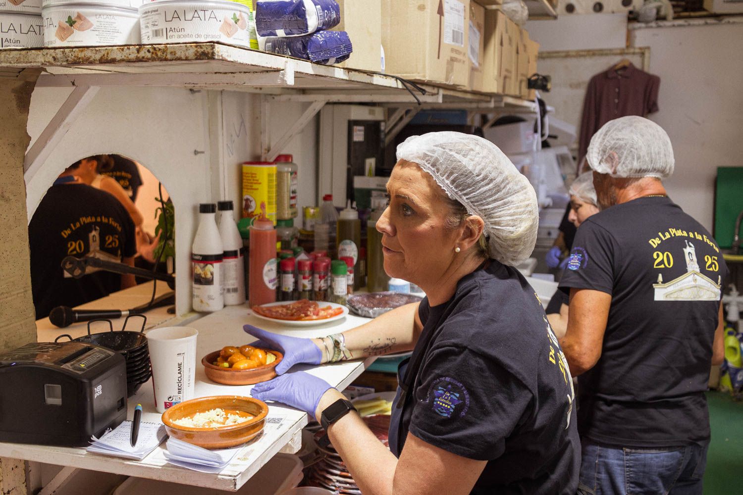 David lleva un año en la hermandad y su labor en la caseta se desarrolla en la barra. Los turnos se organizan con el objetivo de seguir creciendo como hermandad. En total, son aproximadamente 70 hermanos los que participan en los distintos turnos. Junto a él está María Ferrer, quien durante la hora de la comida se encarga de llamar por número a las personas para que recojan sus platos en la barra.