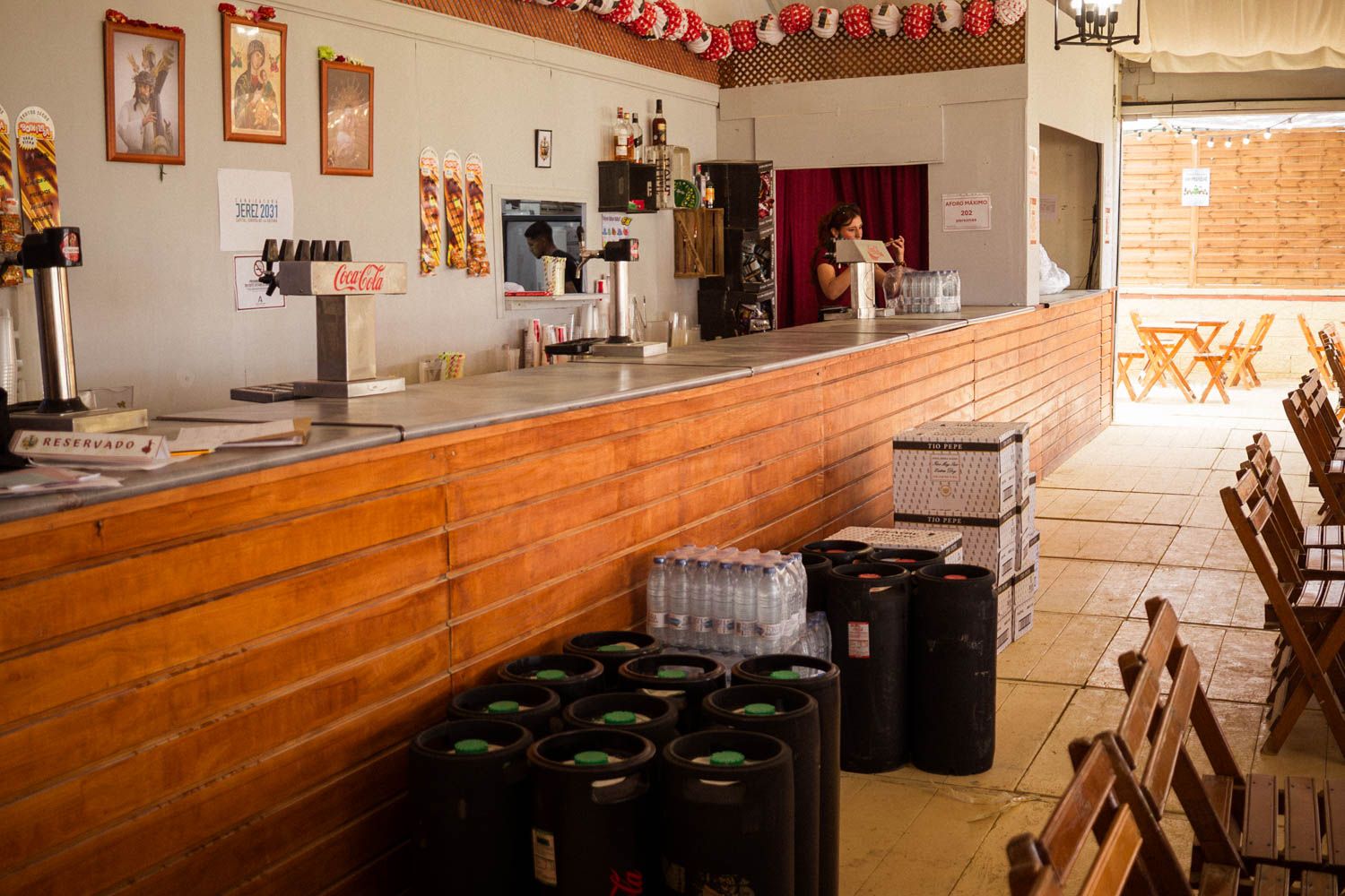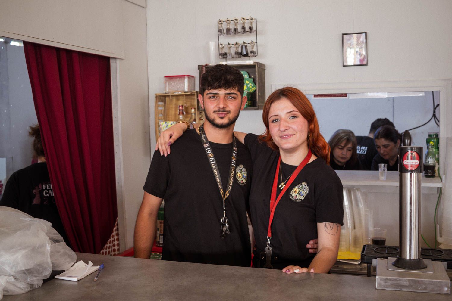 África España, de 54 años, y María Ferrer, de 22, llevan vinculadas a la hermandad desde hace aproximadamente 14 o 16 años, prácticamente desde sus inicios. Ambas coinciden en que han participado en la feria todos los años desde entonces. Respecto al día a día en la caseta, describen la experiencia como gratificante, aunque con momentos de estrés debido a las variaciones en la afluencia de público: a ratos la caseta está vacía, y poco después se llena de gente. Estos altibajos generan tensión, pero también oportunidades para relajarse brevemente antes de que regrese el flujo de visitantes. Destacan el buen ambiente y la sensación de comunidad que se vive entre los hermanos, pese a los inevitables roces que surgen por pasar tantas horas juntos. Sin embargo, estos desacuerdos son pasajeros y no afectan la convivencia, que califican de muy positiva.