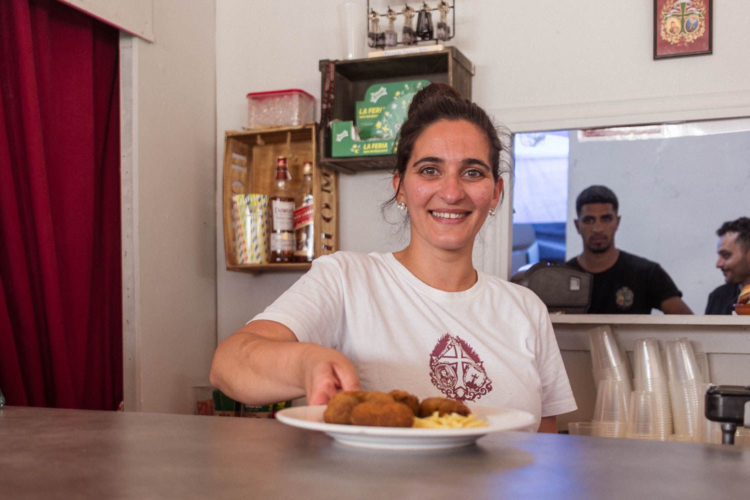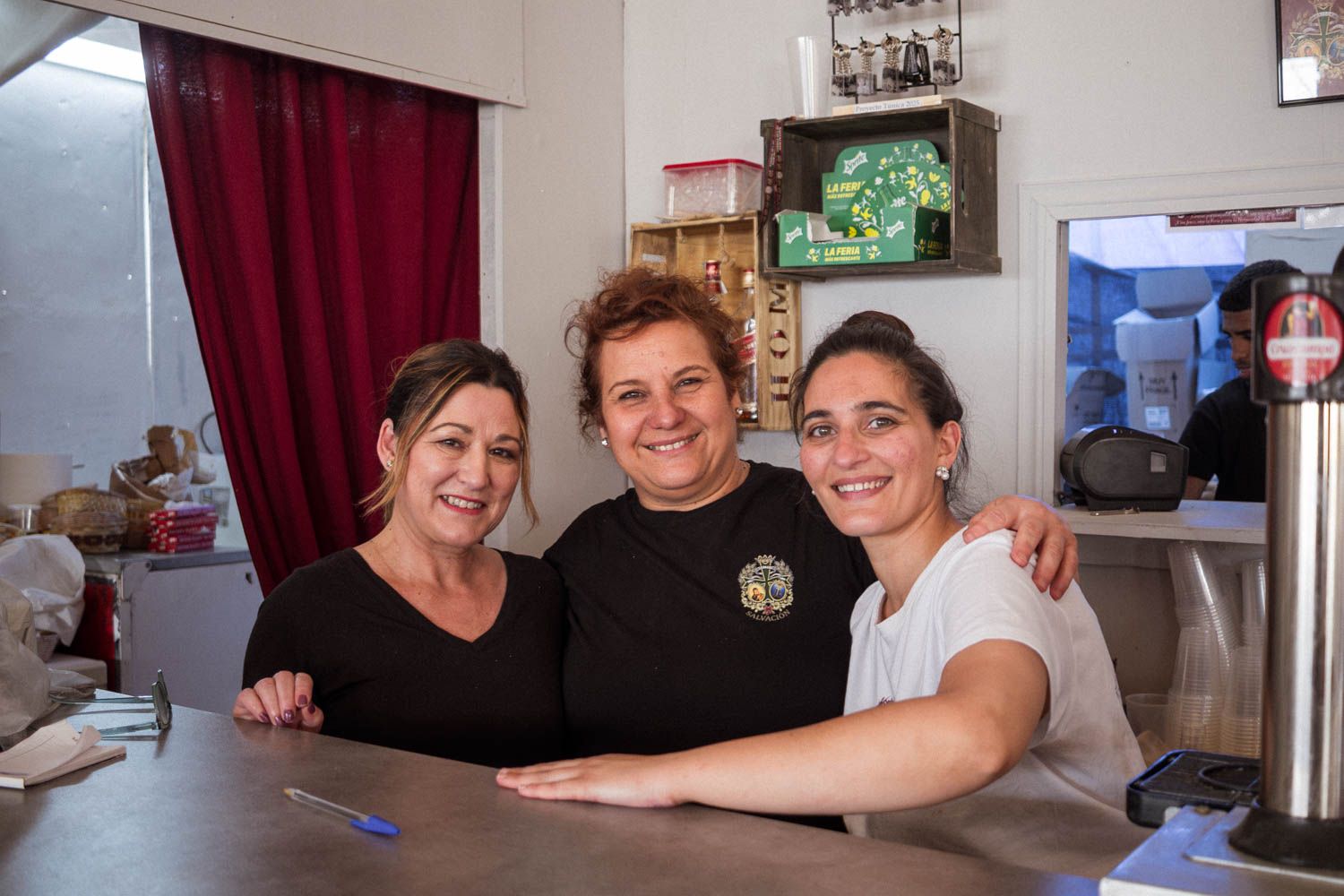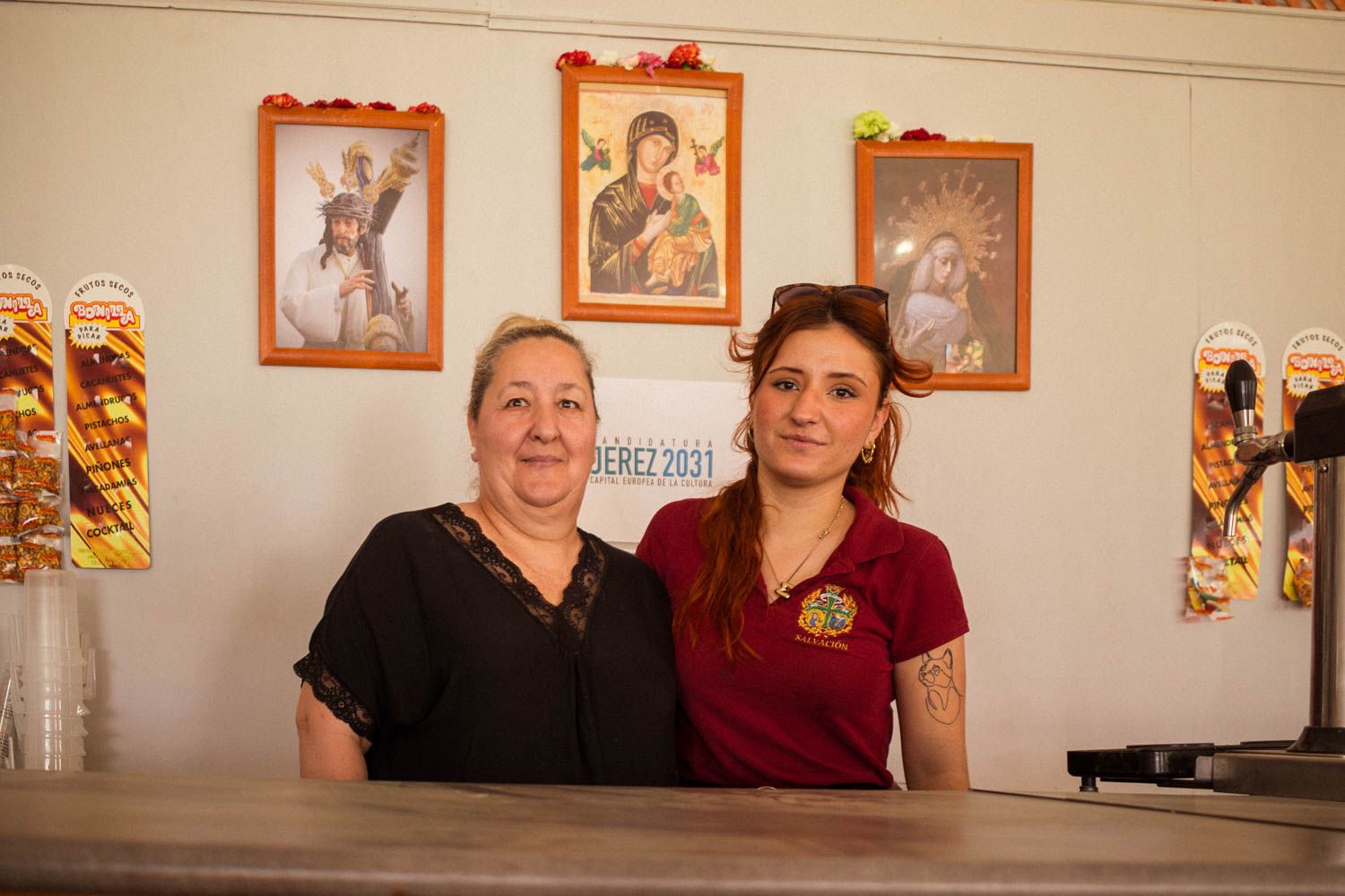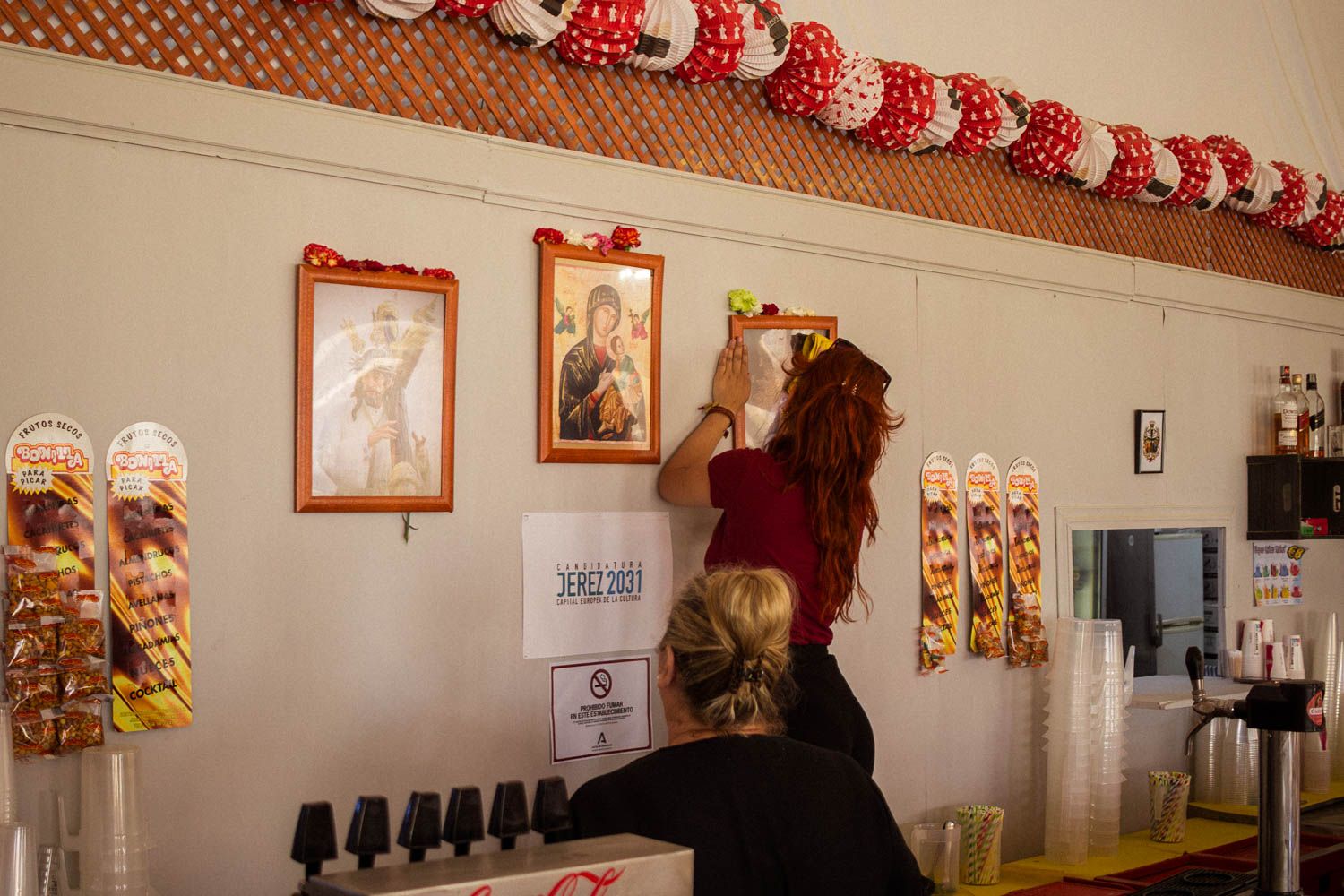 Madre e hija se dedican a poner en orden la barra. La gente deja claveles como ofrenda a las imágenes que están colgadas en la pared. Durante la mañana, antes de que comience a entrar el público, limpian el polvo de los cuadros del día anterior y reorganizan los claveles que se hayan caído.