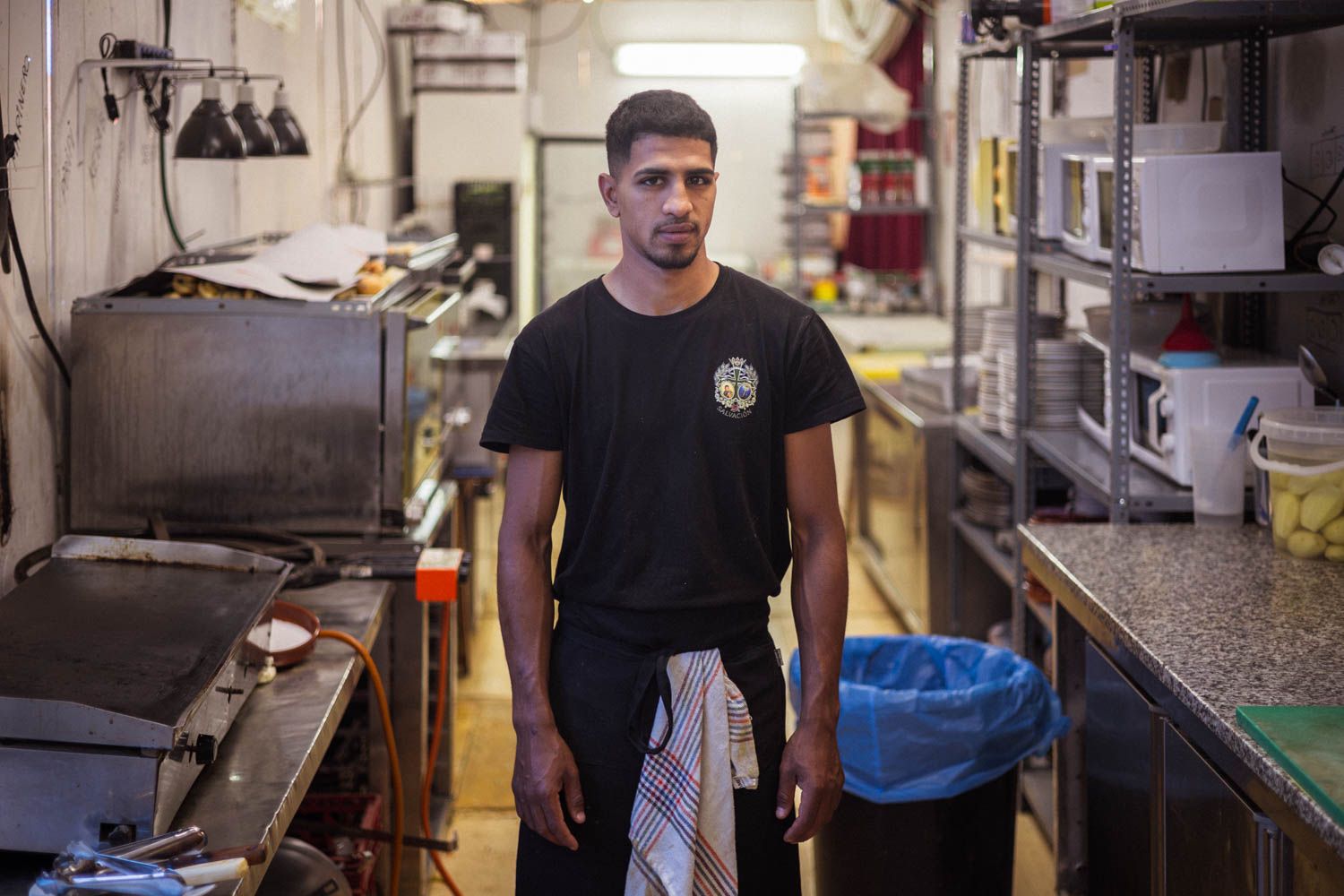 Omar es ayudante de cocina y es de Marruecos. Está colaborando con la Hermandad de la Salvación en todo lo que puede. Esta es su primera Feria trabajando. Lo que más se vende son los guisos del día, que se agotan rápidamente; ayer tuvieron carrillada y hoy papas con chocos. Él es el encargado de preparar el gazpacho y el salmorejo. La gente busca platos frescos para soportar el calor de la Feria.