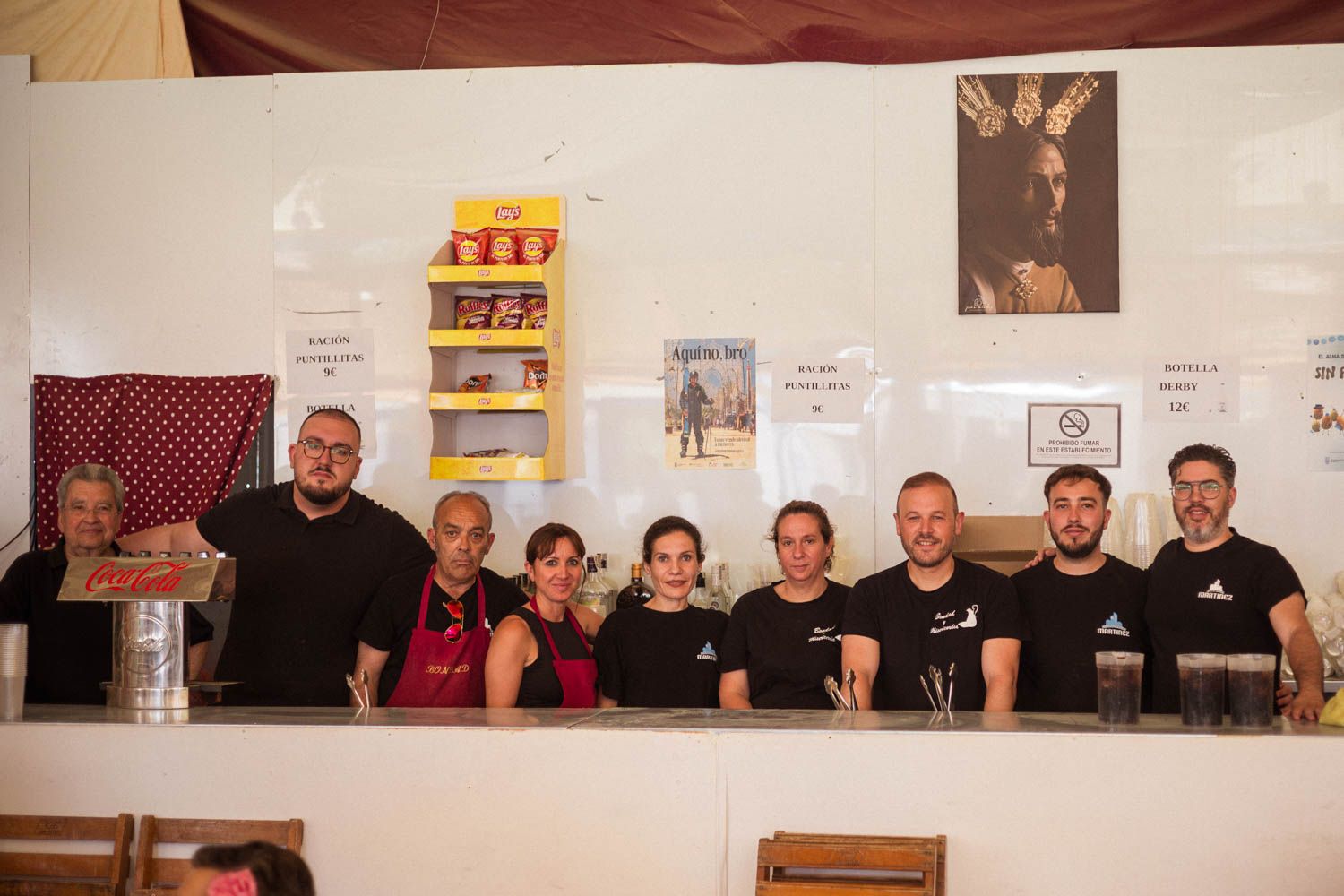 Carmen Villalva, de 52 años, pertenece a la hermandad desde sus inicios y lleva trabajando en la Feria desde hace 10 años. Los turnos se dividen en cocina, barra, recogida de mesas y camareros. Cada hermano se apunta según la disponibilidad que tiene en casa. “Somos un gran equipo, nos llevamos bien y somos un gran equipo. Se incorpora gente nueva y eso es positivo. Es muy gratificante saber que, cuando la hermandad sale a la calle en Semana Santa, un trocito de eso es gracias a nuestro trabajo”, afirma Carmen.