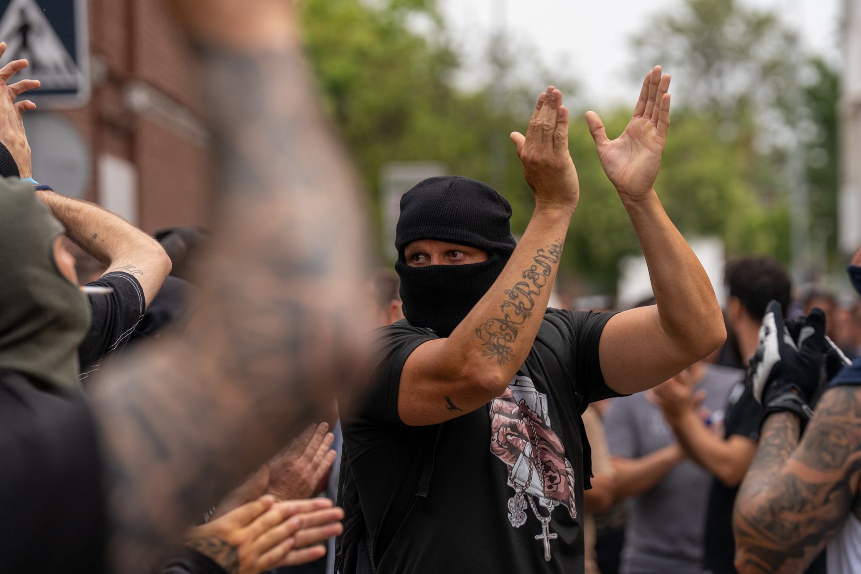 Manifestante del sector del metal alza las manos pacíficamente frente a un cordón de la Policía Nacional durante una protesta.
