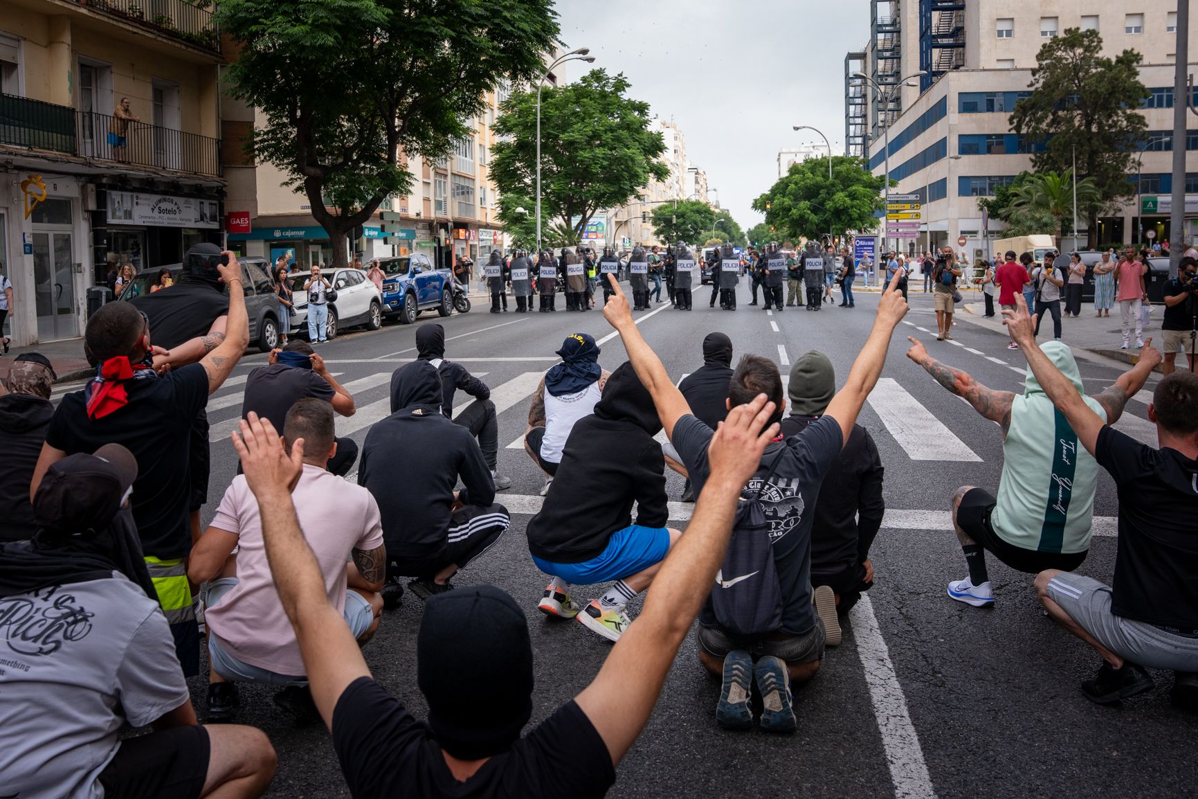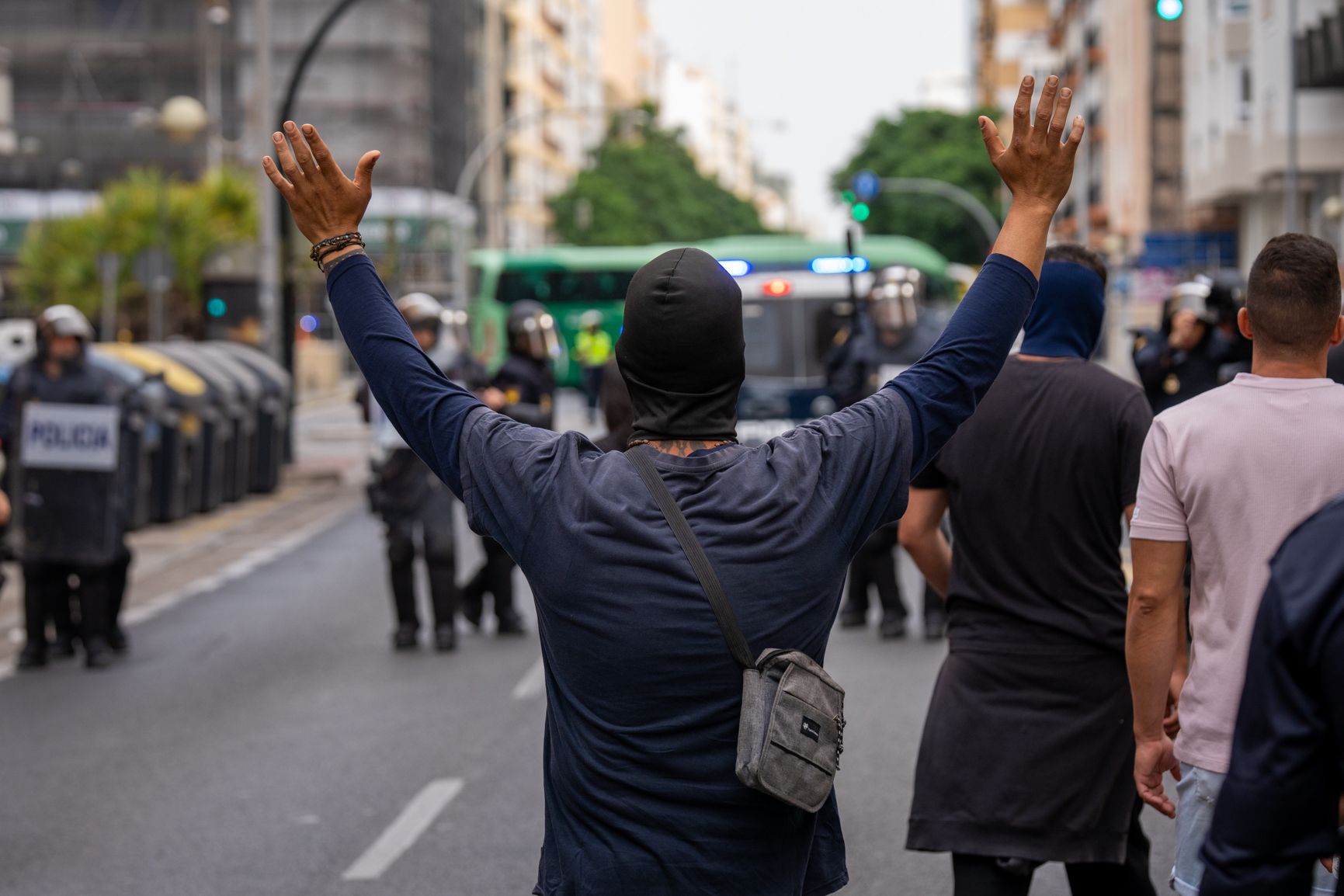 Manifestante con las manos en alto, en señal de paz, frente al cordón policial en la avenida principal de Cádiz