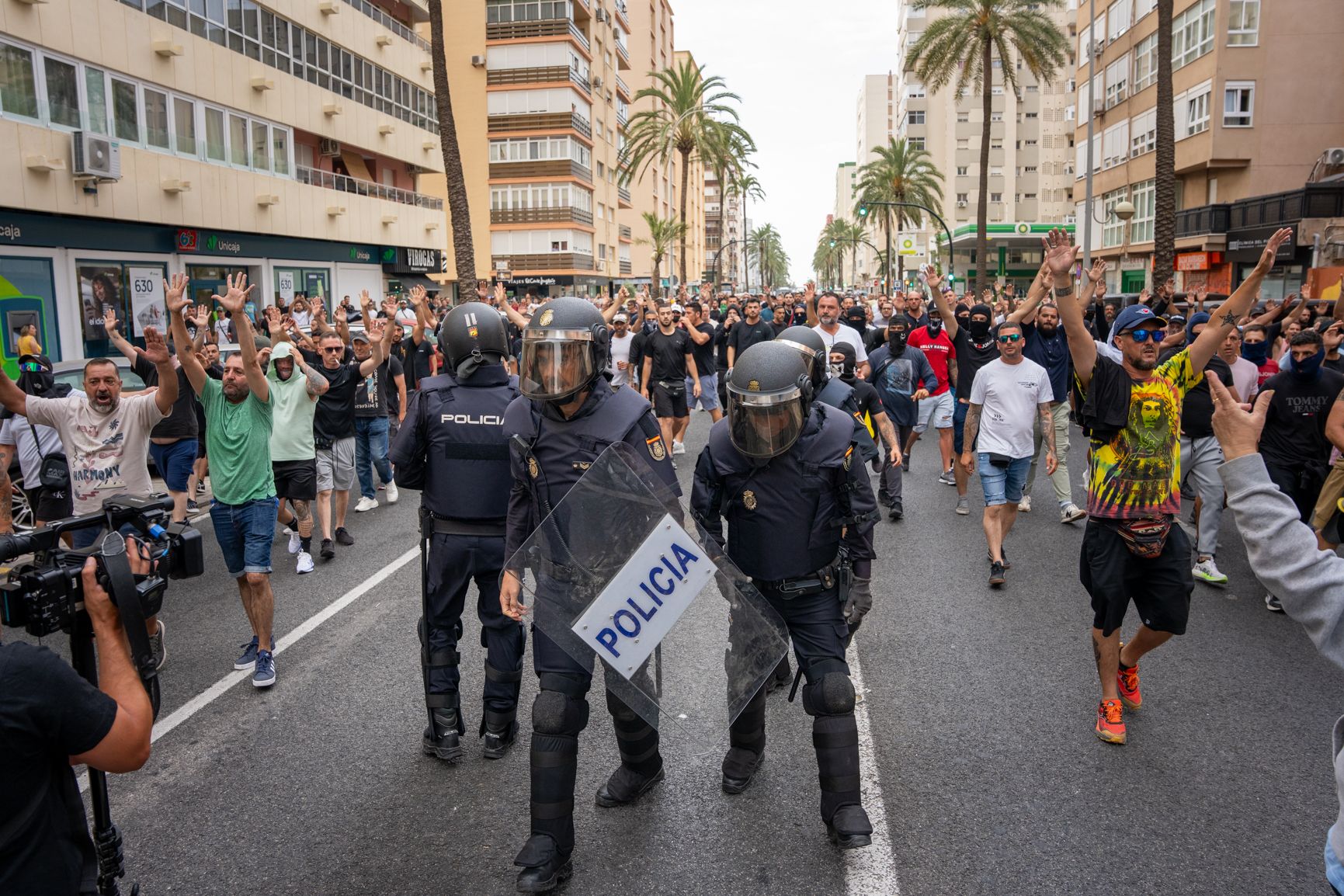 Un grupo de policías, este jueves entre los manifestantes en la avenida principal de Cádiz.