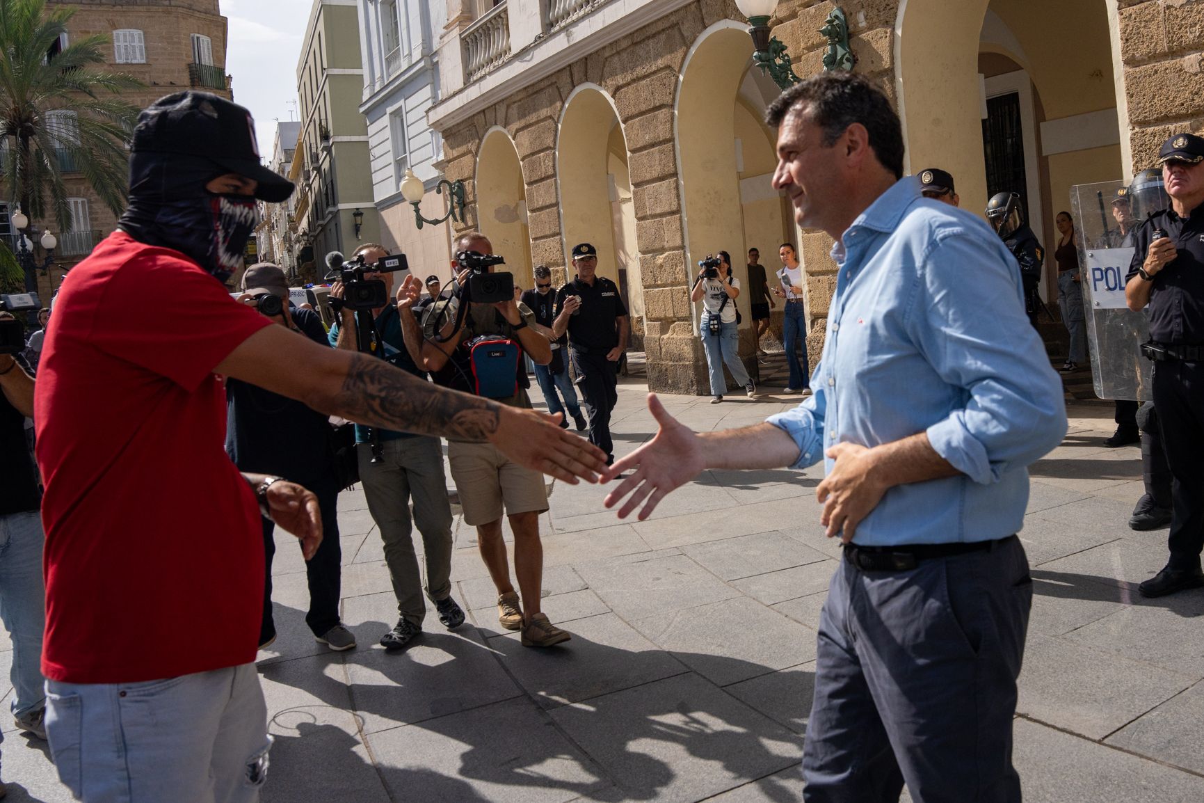 El alcalde de Cádiz estrecha la mano de un manifestante del sector naval en un gesto de acercamiento y diálogo