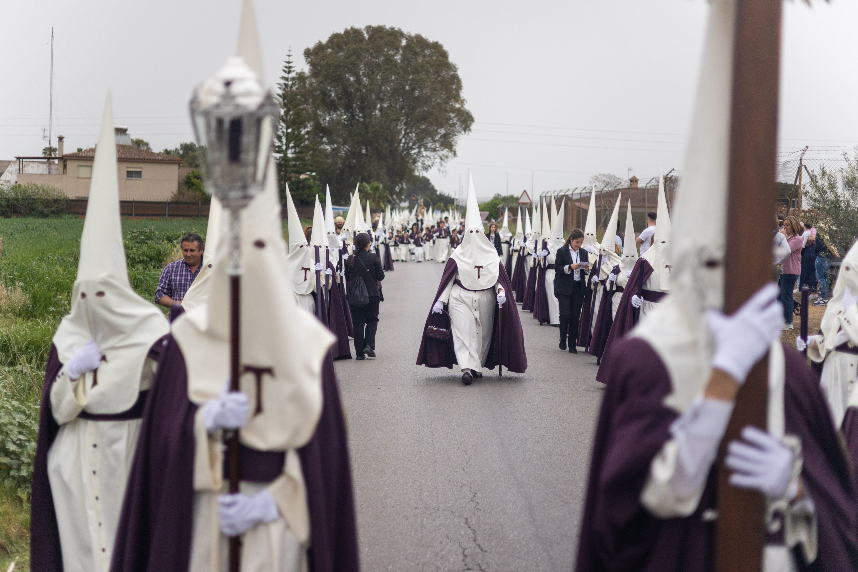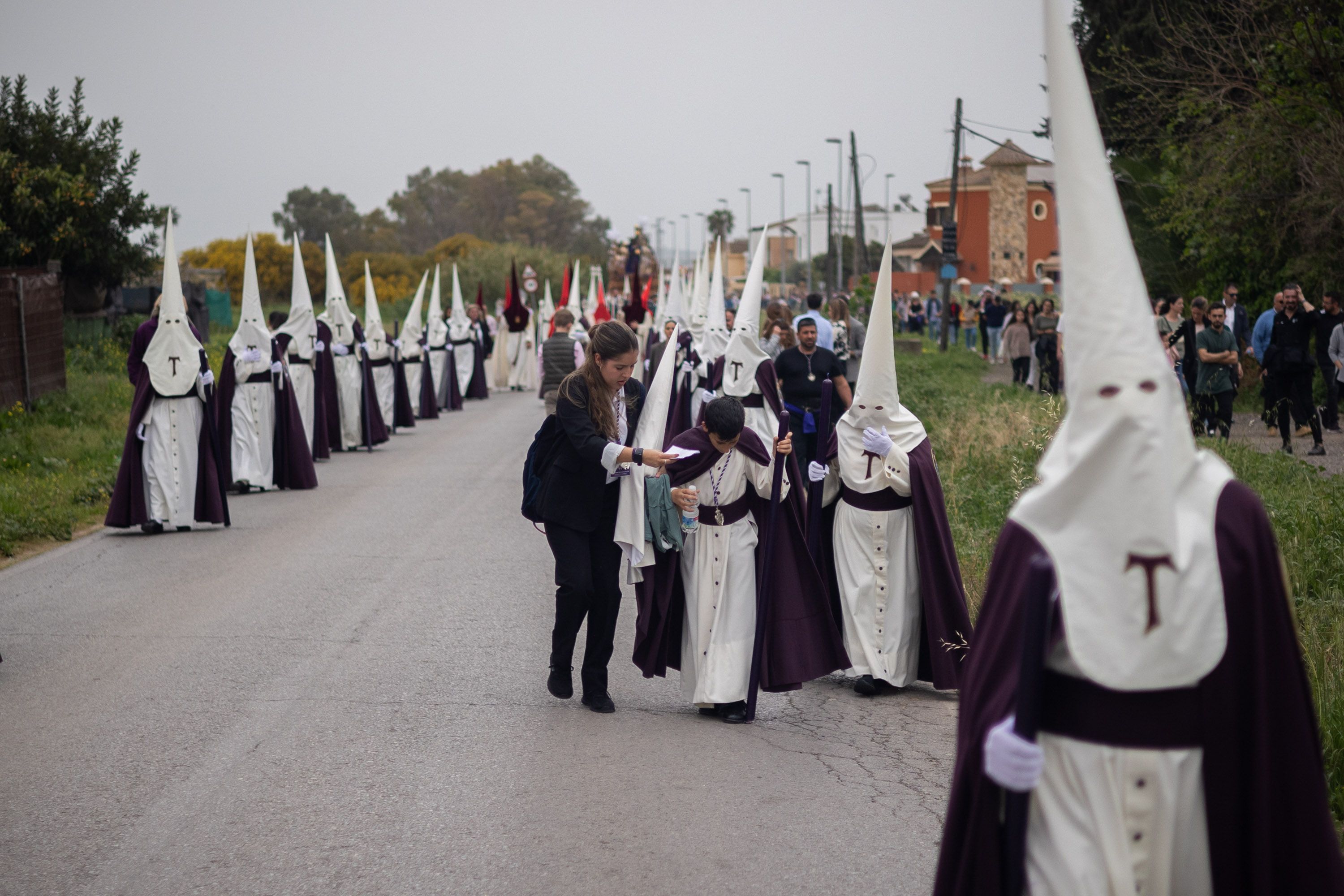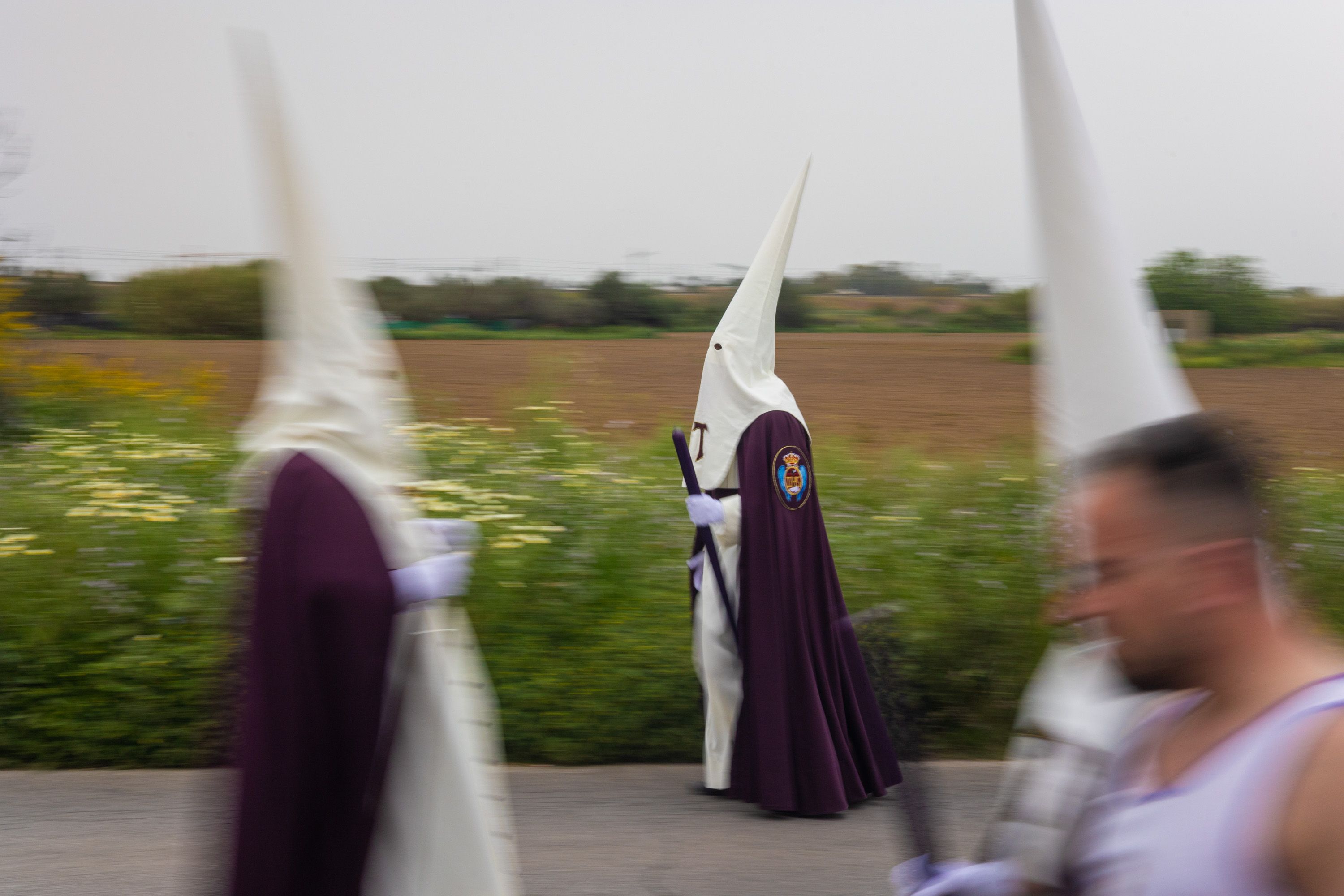Nazarenos de La Entrega el pasado año a su paso por la carretera de Guadalcacín.
