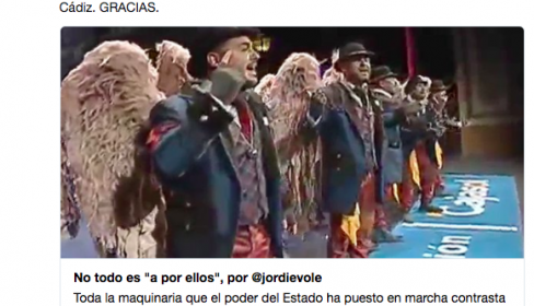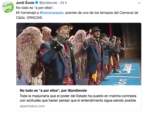 El periodista Jordi Évole, conductor del programa Salvados, de La Sexta, puso de ejemplo este caso en su columna en El Periódico de Catalunya, aludiendo a que, en ocasiones, el independentismo magnifica "el insulto que nos llega de fuera" para "dibujar el enemigo exterior que más le interesa", si bien afirma que "podríamos hacer justo lo contrario", poniendo de ejemplo un pasodoble de la comparsa de Los Carapapas, Los ángeles de la guarda, que no ha tenido apenas eco mediático, y que también trata el tema de la independencia catalana, pero desde el prisma de la 'anticatalanofobia' y la crítica de la proliferación de banderas de España en los balcones para defender la unidad de la nación. La letra, que incluye en su columna, y que ovacionó el Falla —como así destaca Évole—, es la siguiente: