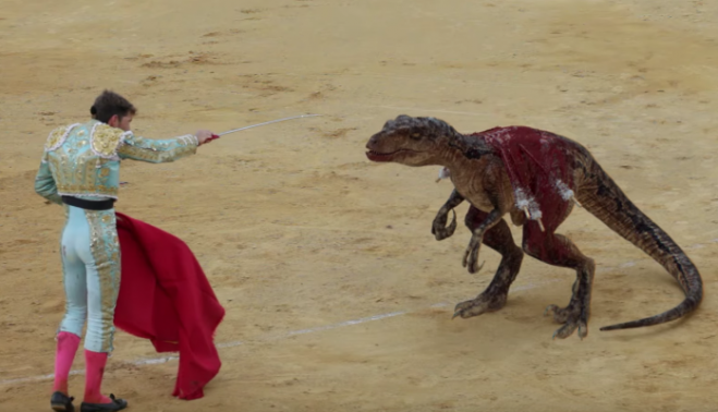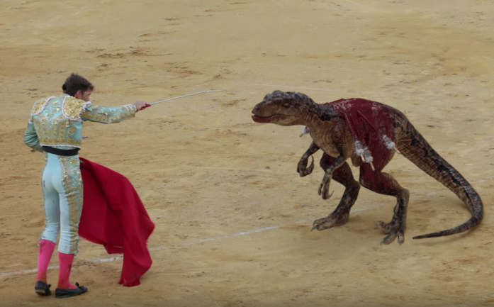 "¿Esta práctica te parece de otra era? Pues todavía perdura". Es el mensaje que la Federación de lucha por la abolición de las corridas (FLAC), ONG francesa que reúne a 14 asociaciones antitaurinas, ha lanzado a través de un espectacular anuncio, que ya se ha hecho viral, en el que el protagonista es un velociraptor que es lidiado en una plaza de toros.
