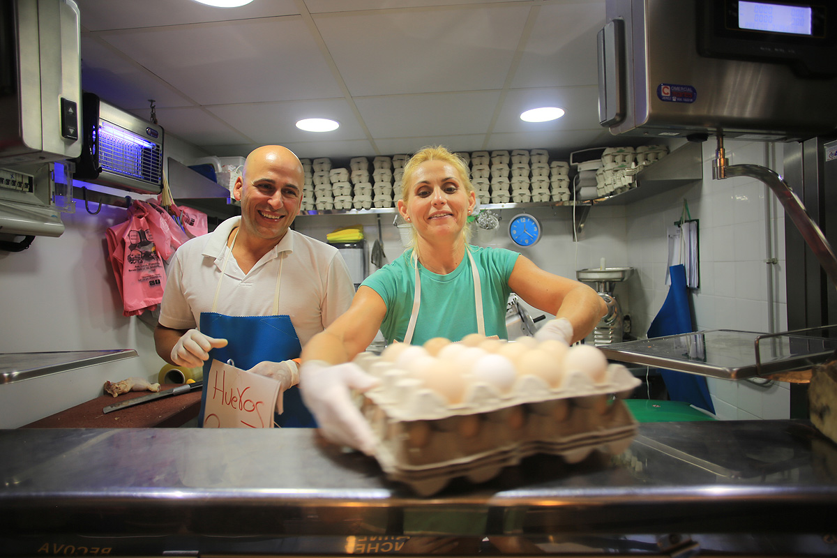 En la misma calle, los últimos en llegar. Hace ya siete años de aquello. El módulo que regentan dos simpáticos sanluqueños, Rocío Raposo y Juanma Cordero, de 38 y 37 años, se llama La nueva recova. "Fue de casualidad. La señora que regentaba el puesto era mayor y contrató a Rocío; pero luego cayó enferma y por desgracia falleció; sus familiares, como ya disponían de otros puestos, renunciaron y al tener preferencia Rocío por ser empleada, nos arriesgamos". En este tiempo, "ya hemos podido amortizar la inversión", asegura Juanma, mientras envuelve con film una bandejita de filetes de pechuga de pollo. En su puesto no faltan los precocinados, innovación más o menos reciente que poco o nada tiene que ver con esos mostradores de rejillas metálicas donde se agolpaban las aves en el siglo pasado. Rocío lo mismo prepara unas berenjenas rellenas que unos rollitos de primavera o unas trompetitas de queso. La amplia variedad de precocinado luce orgullosa en su expositor, otra forma más de hacer rentable su negocio.