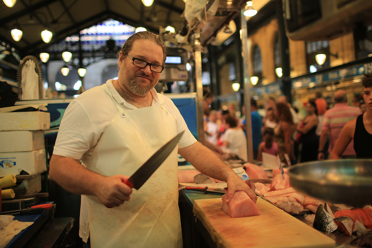 En uno de los vértices de la isleta central de la nave del pescado hay una pequeña montaña de atún rojo salvaje de almadraba, codiciado manjar del que presume Alfonso Delegado El Chaqueta. Su abuelo, "el famoso Chaqueta", legó el puesto a su padre, y su padre a él. Alfonso tiene 45 años y éste cumple tres décadas desde que dejó el colegio y se parapetó en un puesto que lleva más de 60 años en la Plaza. "Recuerdo que la Plaza era un bullicio, esto no tiene ni punto de comparación, por aquí no se podía andar. Jugábamos en medio de los pasillos llenos de gente, la calle Doña Blanca era una feria. Eso se ha perdido. Nada más que quedan cuatro borrachos. Ahora todo es para las grandes superficies, aquí son todo problemas aunque haya cosas que no vas a encontrar en el Carrefour", relata mientras su cuchillo se hunde en la carne magra de un marrajo fresco.