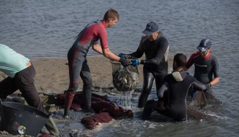 El espectáculo, visualmente, es espectacular. Entre cuatro personas toman el copo y van acorralando a los peces. En apenas unos minutos, con ayuda de otros compañeros, empiezan a sacarlos y a introducirlos en cestos. Los pescados que no tienen el tamaño adecuado son devueltos a otro estero, mientras que los que sí lo tienen acaban en cajas de plástico ante la expectación del público. En un 99 por ciento la captura es de lisas, aunque en la red ha caído alguna dorada, un choco y hasta un cangrejo, que tras ser curioseado por varios niños acaba en el agua. En poco más de una hora se han recolectado decenas de kilos de pescado, que tras ser lavado, se pone a disposición de unos clientes que hacen una ordenada cola para comprarlo. Naturaleza, historia, pesca y gastronomía en apenas una mañana. ¿Se puede pedir más?