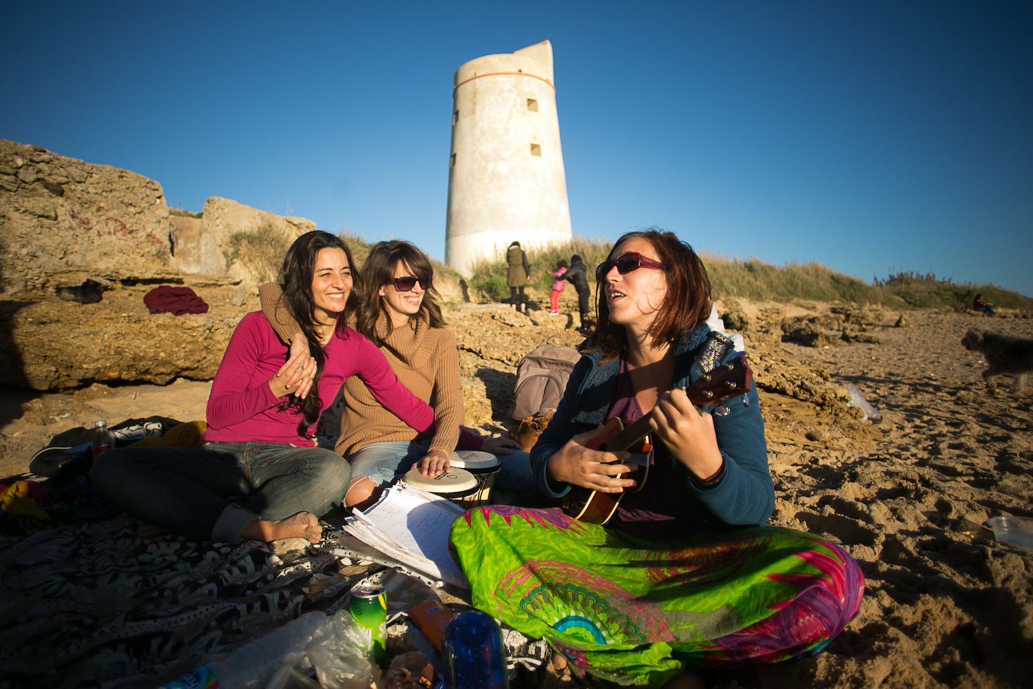 Es ésta última la que entona uno de los himnos de los garrapateros: “Yo me levanto temprano y me pongo a trabajar / con mi guitarra en la mano yo nunca paro de cantar / a mí me llaman el descalzo porque en invierno uso chanclas…”, se arranca, ukelele en mano. “Los andaluces nacemos donde queremos”, suelta casi con acento gaditano afrancesado. Su amiga, que la acompaña con los bongos, cuenta que la playa está sufriendo “una involución”. “En verano no se puede estar”. Por eso ya frecuentan otras, como Bolonia. “A ver si echamos a la gente cantando…”, dice entre risas.
