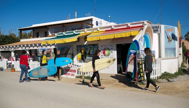 Vicen Lamaison, en una de sus visitas a la provincia para practicar su deporte favorito –el surf, claro–, decidió dejarlo todo y fundar la que es una de las mejores escuelas de Andalucía. “Se enamoró del cielo”, cuenta quien lo conoce. Vendió un restaurante que tenía en Francia y abrió el negocio, primero como cafetería, y luego mutó a tienda y escuela de surf. “Fue un visionario”, dice Dori, dependienta de Kotadalu. “Y sigue siéndolo”, añade. Ella, que lleva más de cinco años trabajando en El Palmar, ha visto la espectacular progresión de visitantes de la playa en el último lustro. “No tiene nada que ver 2010 a lo que hay ahora”, dice. Cuenta que su pareja es oriunda de la zona y que “los vecinos de El Palmar alucinan”.