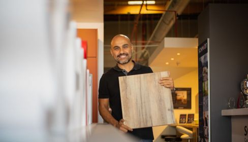 Este año, ha ido más allá. Ha lanzado una gama de tableros de madera 100% reciclada. A los tableros estándar-que ya cuentan con un porcentaje de materiales reciclados- se suman los que están construidos solo y exclusivamente de esta forma. “Si los tocas tienen un tacto diferente. Es bastante realista y la textura de las vetas apenas se nota”, dice Julio mientras presenta la gama Origin, el último proyecto de la marca para que 750.000 árboles al año no sean cortados.