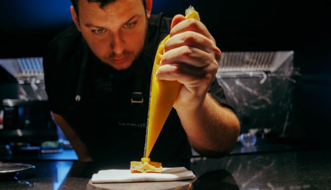 El chef asegura que se trata de una evolución natural tras casi una década como autónomo. La filosofía culinaria se mantiene: producto, técnica y creatividad, pero ahora con un enfoque más emocional. Su único menú degustación, Año Cero Tarab, propone 13 pases y tiene un precio de 89 euros, con opción de maridaje por 45 euros. “Tarab es una palabra árabe que significa éxtasis emocional, y lo hemos querido llevar a la mesa”, explica.