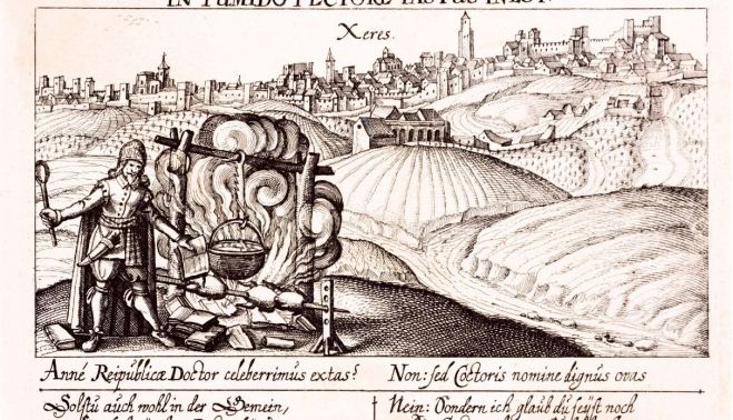 Existe en la Biblioteca Municipal un viejo grabado del siglo XVII en el que se ve en un primer plano a un guerrero que, armado con un caldero, asa unos pollos utilizando como combustible y para alegrar la hoguera, varios libros. Al fondo, la ciudad de Jerez. Un querido y admirado profesor, ya fallecido desgraciadamente, contemplando la imagen y en un arranque de humor, lo bautizó con un comentario: “En Jerez se come muy bien”.