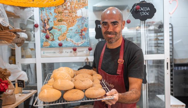 Estás hablando conmigo, pero Horno 13 somos Mauro y Bárbara, mi mujer. Los dos. Ella hace más que yo. Yo soy la cara porque soy el que vende y el que produce. Hacemos pan y bizcocho, todo horneado en el mismo día. Por eso empezamos muy temprano. Mi mujer, a las cinco y media de la mañana, ya está en el negocio. Lo primero es hacer el pan. Y a las 9 empiezan a salir las cosas del horno. Normalmente, sale pan hasta el mediodía. Luego mi mujer se va a casa y yo me quedo hasta el final del día. Yo hago la focaccia y algún bizcocho, y ella hace el pan. Así funcionamos.