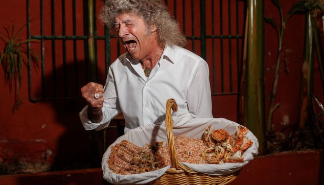 "El canasto hay que prepararlo con mucho amor. Como si fuera para ti. Y tiene que tener el mismo peso por todos lados, que quede equilibrado". Dice que el pantalón que lleva le ha costado 120 euros en El Corte Inglés, la camisa que viste luce blanca nuclear, "bien planchaíta". Se prepara como un torero en capilla. "Y las cañaíllas para abrirlas se meten unas con otras", explica, mientras ofrece hasta la hueva. Remata la faena, se prepara el fajín con sus sobrecitos, y sentencia: "Y esta es la esencia del canasto: ética y estética van juntas, si no llevas el canasto bien preparado y limpio… Las cajetas, las bocas, los camarones… todo enjuagado y bien lavado, fíjate la brillantez del camarón". Otro consejo, antes de entrar en el universo de José de los Camarones, cantaor: " Yo cuezo el marisco y el secreto está en que el agua hirviendo esté sabrosita, mejor quedarse cortitos que eso tiene solución".