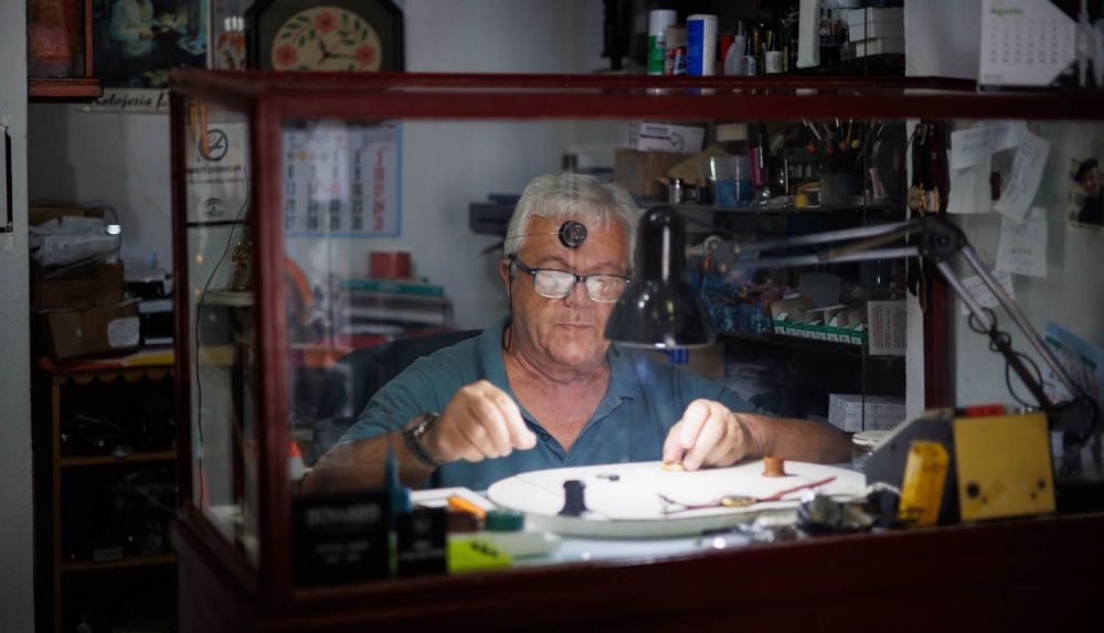 Desde hace 55 años. Empecé con 13 o 14 años en una tienda de la Porvera, frente a la Iglesia de la Victoria. Allí era el niño de los mandados. Había un relojero, Francisco García Espinoza, siempre impecable. Cuando él se estableció, me dijo: Paquito, vente a mi taller y te enseño.