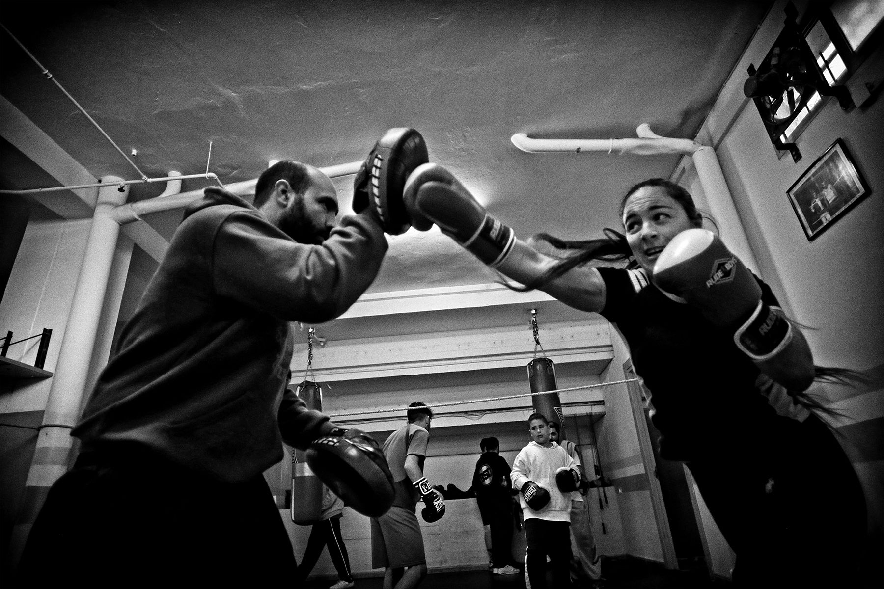 A Jessica Jiménez, de 30 años, la pillamos haciendo manoplas. A pesar de lo que pueda parecer, el boxeo femenino no es algo raro. En el Don Príncipe son varias las chicas que lo practican y, en el caso de Jessica, la pasión le vino gracias a uno de sus hijos. “Al más chico le gustaba el boxeo y lo apunté con seis o siete años y a raíz de eso me apunté yo también. Luego el colegio le quitó tiempo de venir aquí, pero yo sigo entrenando”. ¿Nota machismo?, le preguntamos. “Para nada. Aquí somos todos iguales y nadie se mete con nadie. Aquí venimos porque nos gusta el deporte y el boxeo”.