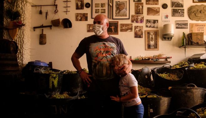 “Mi padre estuvo mucho tiempo de encargado en Harveys e iba por los caminos con las horquillas, o con un sarmiento, y la gente decía: ahí viene el de la vara, el de la vara… y se le quedó”, relata Juan, mientras se le acerca, jugueteando entre los capazos de uva, su hijo, también Juan Núñez, la nueva y rubia generación de los de la Vara. El abuelo, Juan de la Vara, no solo vive sino que, a sus 78 años y tras “dos o tres ictus”, sigue “vendimiando y bebiendo”, confiesa orgulloso su hijo antes de rememorar cómo empezó este juego mitad negocio-mitad distracción. “Esto lleva abierto uno 35 años y yo estoy aquí desde chico. Mii padre lo deja en el primer ictus y aquí me quedé. Y lo malo es que me gusta el mundillo este y me gusta el mosto, así que no junto dinero, y menos con mujer y tres hijos. Mi padre decía: si a los 35 no eres rico, ¡arre borrico!”.