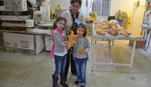 Una pequeña coge un bollo de pan en uno de los obradores de la ruta.