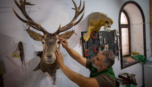 En las paredes cuelgan encargos en proceso y otros terminados o a medio concluir. Y de cuernos, sin ningún sentido peyorativo, muchos y variados porque en este taller solo se dedican al disecado de la caza mayor; no entran en aves ni en otras especies. “Es imposible saber cuántos animales he disecado”, señala Ramón padre, que sí se muestra orgulloso porque “muchos clientes aún me recuerdan algunas de las piezas que les trabajé”. Aprendió el oficio de un hermano suyo. Fue en Cazorla.