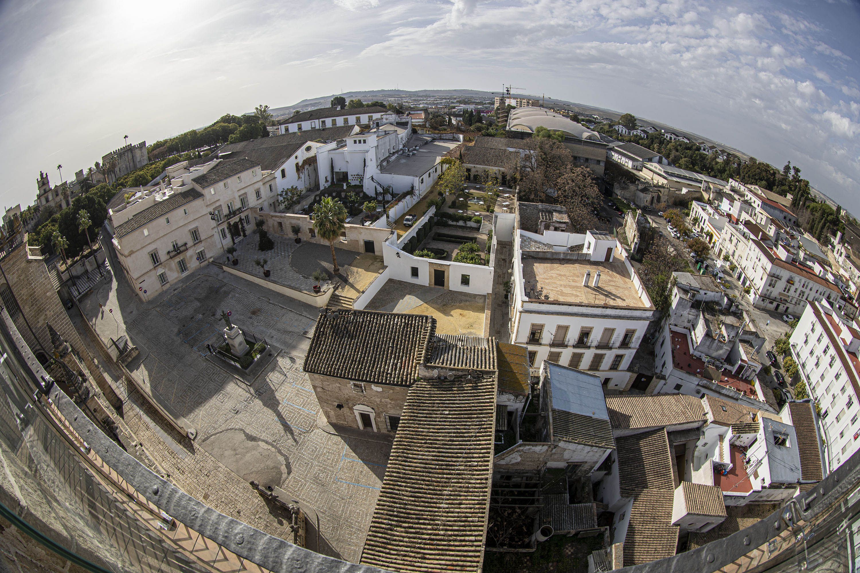 Desde lo más alto, tras superar las retorcidas escaleras de la torre —felizmente rehabilitada para su apertura al público hace ahora tres años—, la vista del municipio es privilegiada. No solo se aprecian las cúpulas y techos de la monumental colección de obras de arte en piedra que alberga el Jerez medieval, también se palpa la gloria bodeguera de otra época en los conjuntos industriales de González Byass y Domecq o el clásico perfilado de las torres de la antigua fábrica de botellas. Se ve el frondoso jardín del convento del Espíritu Santo, se aprecia un cartelito de se vende en el palacio de los Condes de Puerto Hermoso —hasta hace no mucho Comisaría de Policía—, y hasta se divisa un pedazo de la bola navideña que decora la recuperada plaza Belén, avanzadilla desde nuevo intramuros por venir.