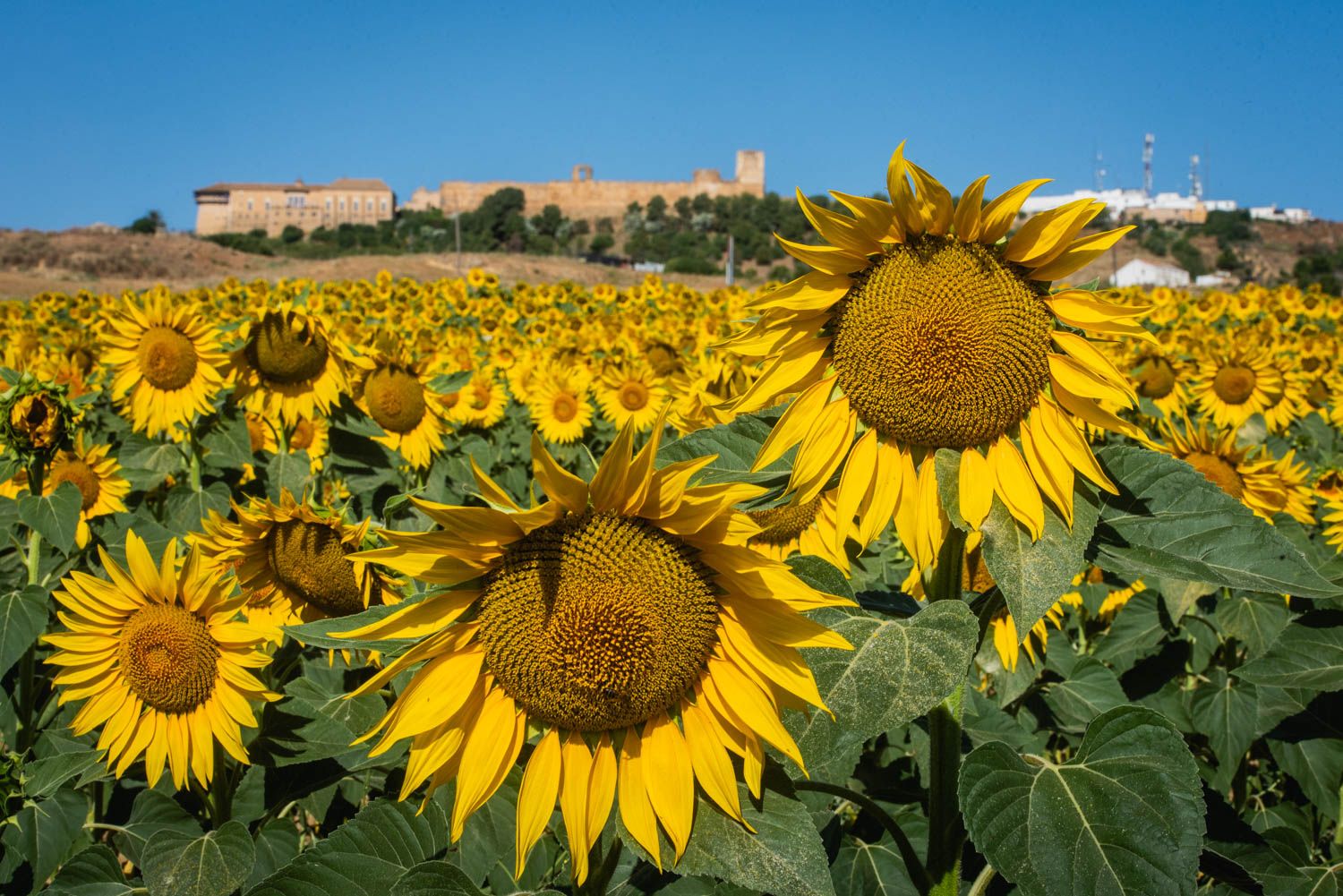 Bajamos camino de Marchena, buscando una imagen única del Alcázar del Reino don Pedro, hoy Parador de Turismo y del escarpe de la milenaria ciudad. Un lugar donde los girasoles, tan bellos como efímeros, se encuentran en su floración óptima. El calor aprieta de lo lindo esta semana, por lo que aquel visitante que quiera verlos en su esplendor debe darse prisa. Es lo que tiene la madre naturaleza.