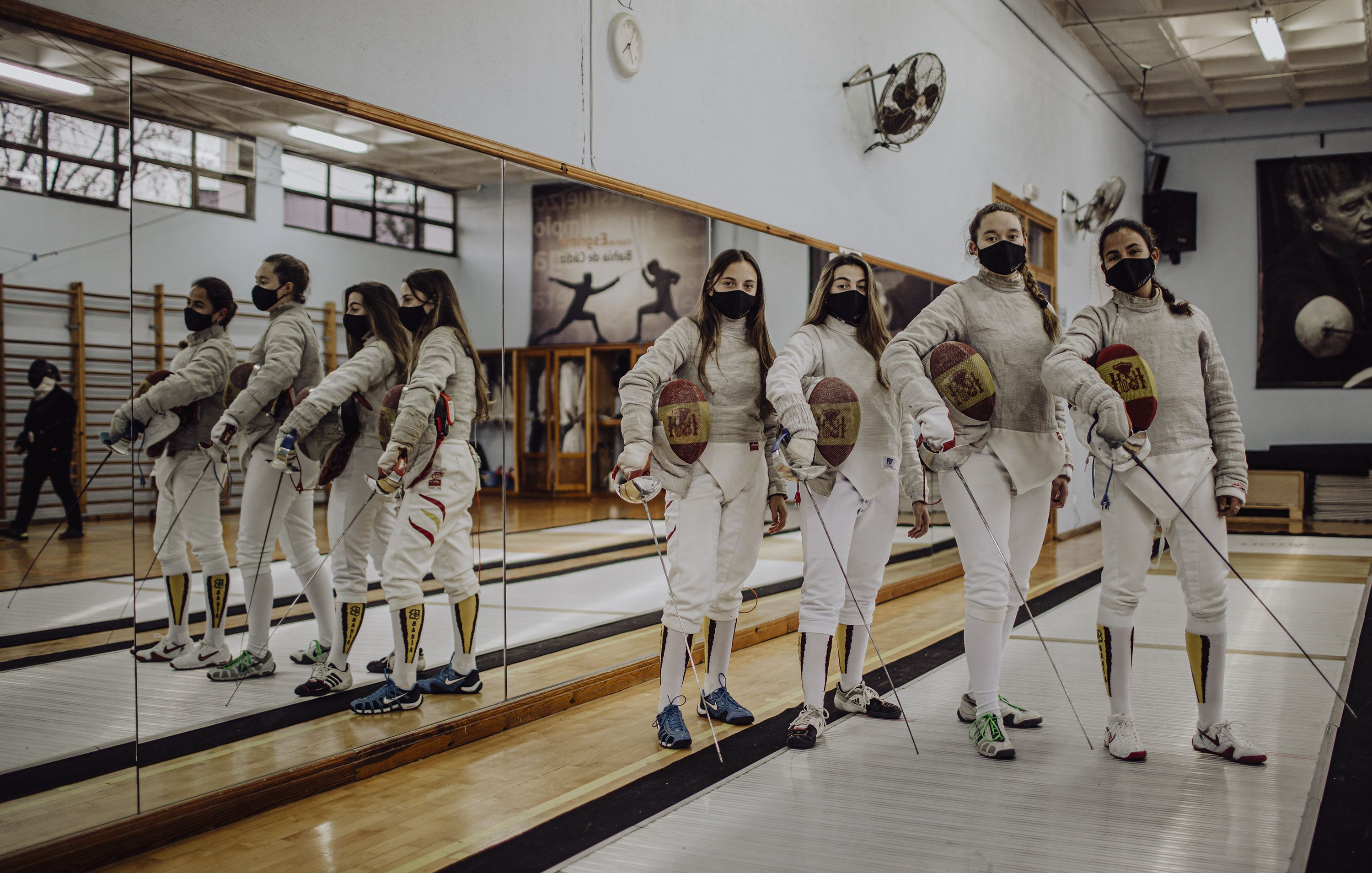 Desde casa, se reinventaron para no perder el ritmo. “Seguimos entrenando online, me mandaban las tareas, al ser individual podía practicar sola con lo que se llama el plastrón, me rellenaba la chaquetilla con cojines, había que buscarse la vida”, dice Eva Nieto. A sus 16 años, es la primera de Andalucía y la tercera en el ranking nacional de sable en su categoría de cadete. La gaditana no dejó ni un segundo este deporte que fue de los primeros en volver a la carga de forma presencial. “Hemos tenido una serie de ventajas, ya solamente con el arma debes tener un metro de distancia de seguridad, además llevamos caretas y la mano armada lleva guante”, destaca Carolina. Su indumentaria ha sido la clave para continuar en estos tiempos con seguridad. Aun así, desde que volvieron a la pista, mantienen las medidas a raja tabla.