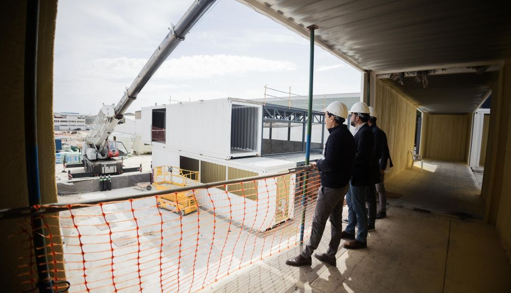 “Sin duda es un proyecto pionero aquí”, señala elevando su mirada al cielo. “En el extranjero se han hecho muchos y en Sevilla, en Barcelona, pero tantos contenedores destinados para este uso, no me consta”, explica frente a lo que será una fachada blanca con elementos de color rojo y escaleras amarillas. Carlos asegura que esta “no es una obra al uso” y destaca la singularidad que presenta en su proceso constructivo, donde trabajan personas tanto en el solar como en talleres.