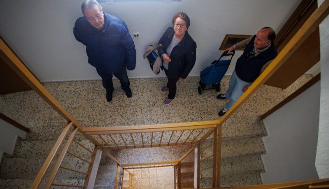 En unos bloques donde la mayor parte de los inquilinos son personas mayores y que llevan en ellos, en muchas ocasiones, más de tres décadas, la falta de ascensores se torna una verdadera amenaza para quienes allí residen. Soledad tiene fibromialgia y vive en un séptimo; solo sale una vez al día para ir a cuidar de su madre, que ronda los 70 años, y para hacer las compras. "Aquí vivía una mujer en el cuarto piso que iba a diálisis; tenía que sentarse en las escaleras y bajar escalón a escalón", denuncia. Lola, por su parte, cuenta que no va al médico porque "me van a escayolar la pierna y no puedo quedarme tres meses encerrada". No puede permitirse quedar atrapada en su vivienda ante la falta de ascensor.