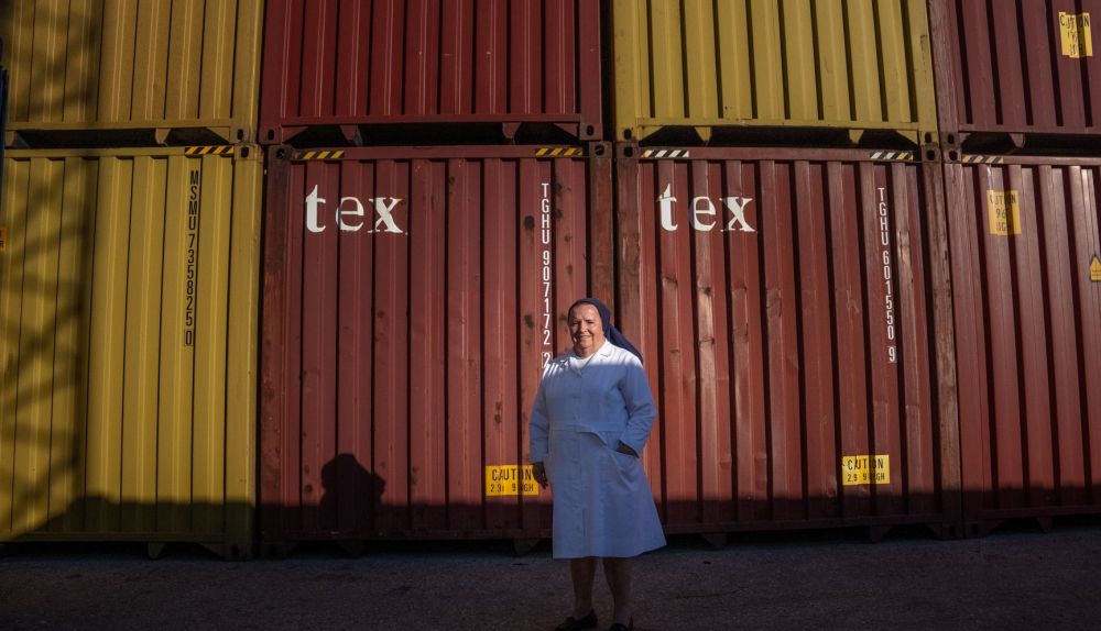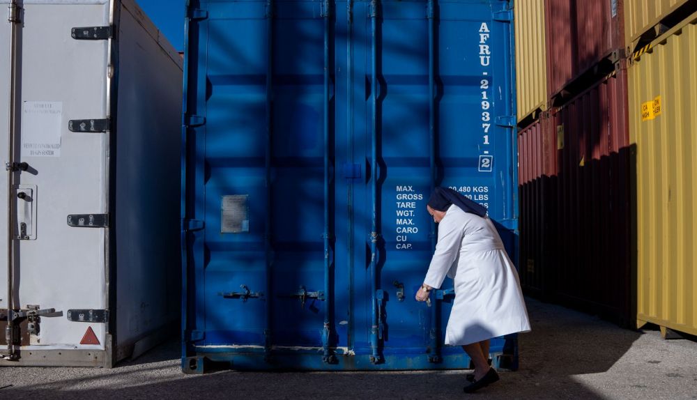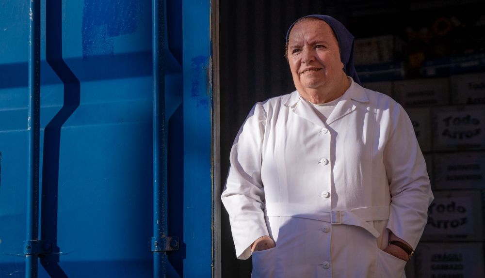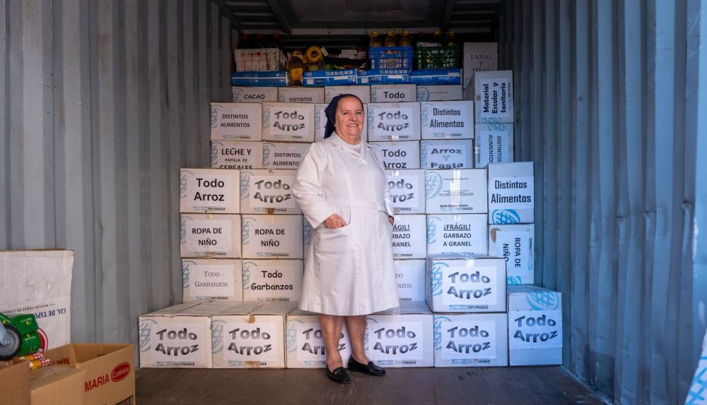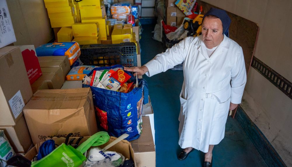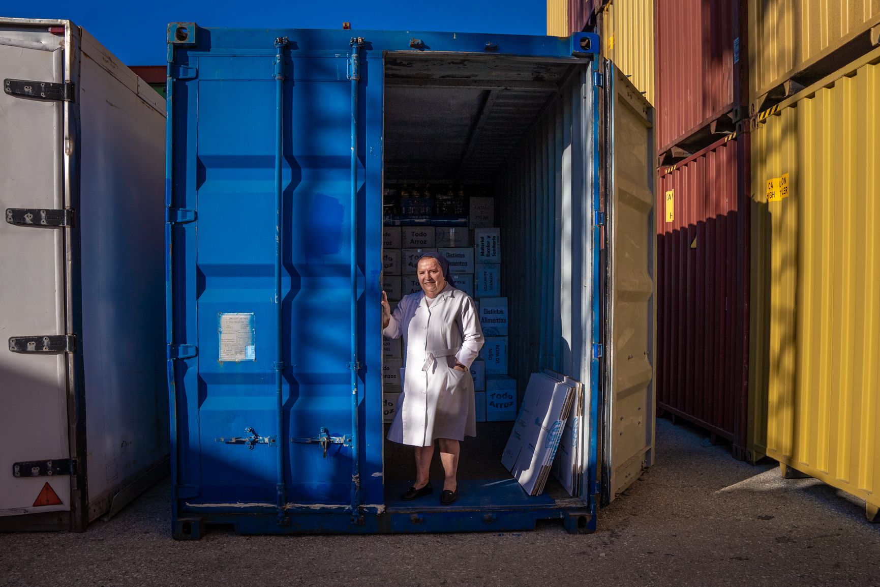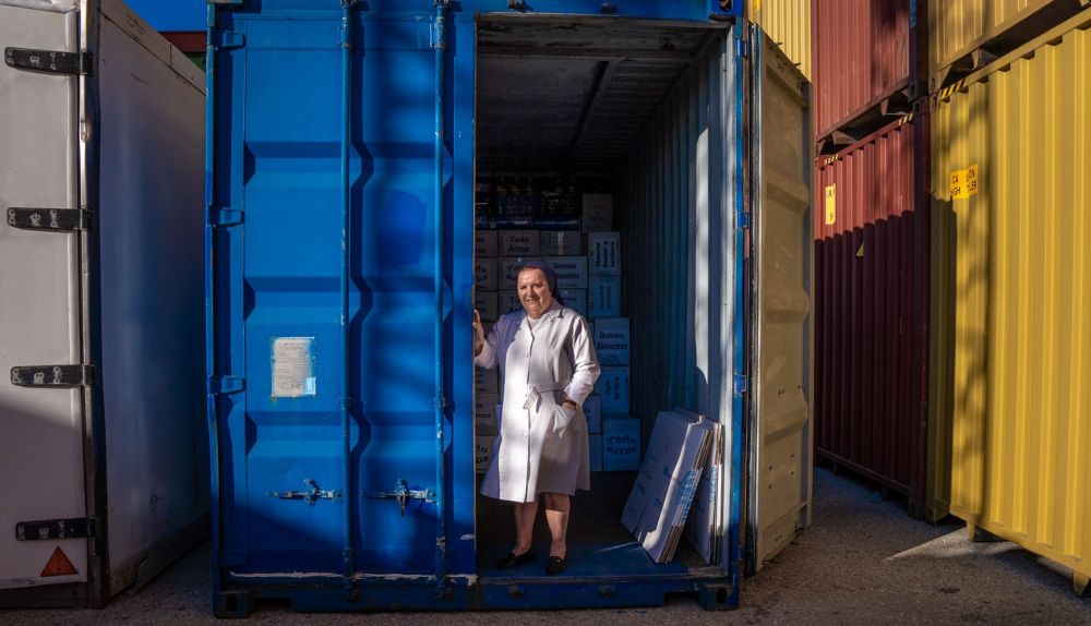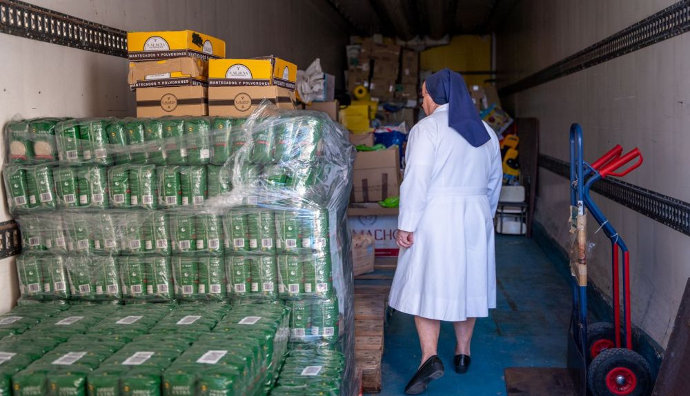 Su voz resuena dentro del contenedor, que recibe donaciones de personas solidarias que desean poner su granito de arena. El año pasado, pesó 20 toneladas, entre 12.000 kilos de legumbres, 1.500 de pasta y otras cantidades. Sin embargo, la hermana asegura que, este año, está costando más debido a la infame subida de precios.